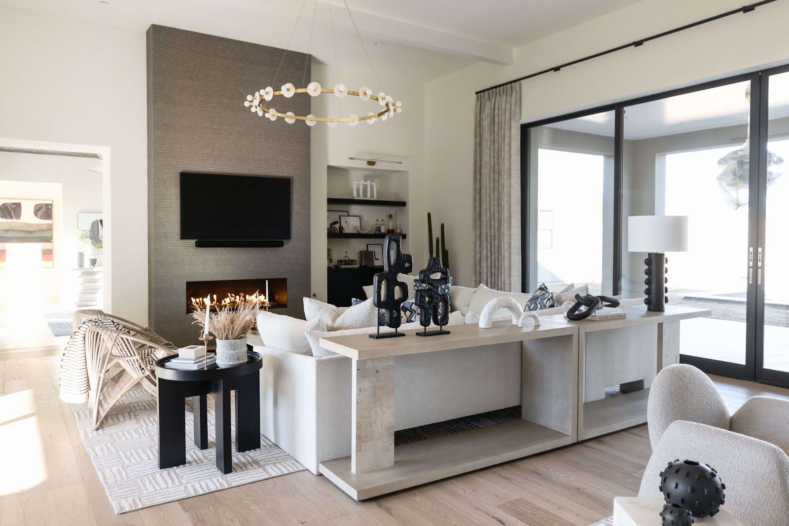 On the other side of the living room, we hung the same light fixture and drapery for balance and consistency. To further elongate the ceiling, we added a tiled fireplace from floor to ceiling, displaying a Samsung Picture Frame TV and gas fireplace. We love how it serves as a focal point for the interior!