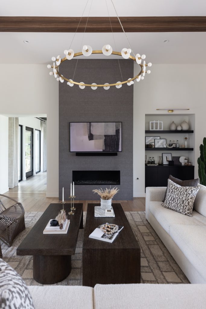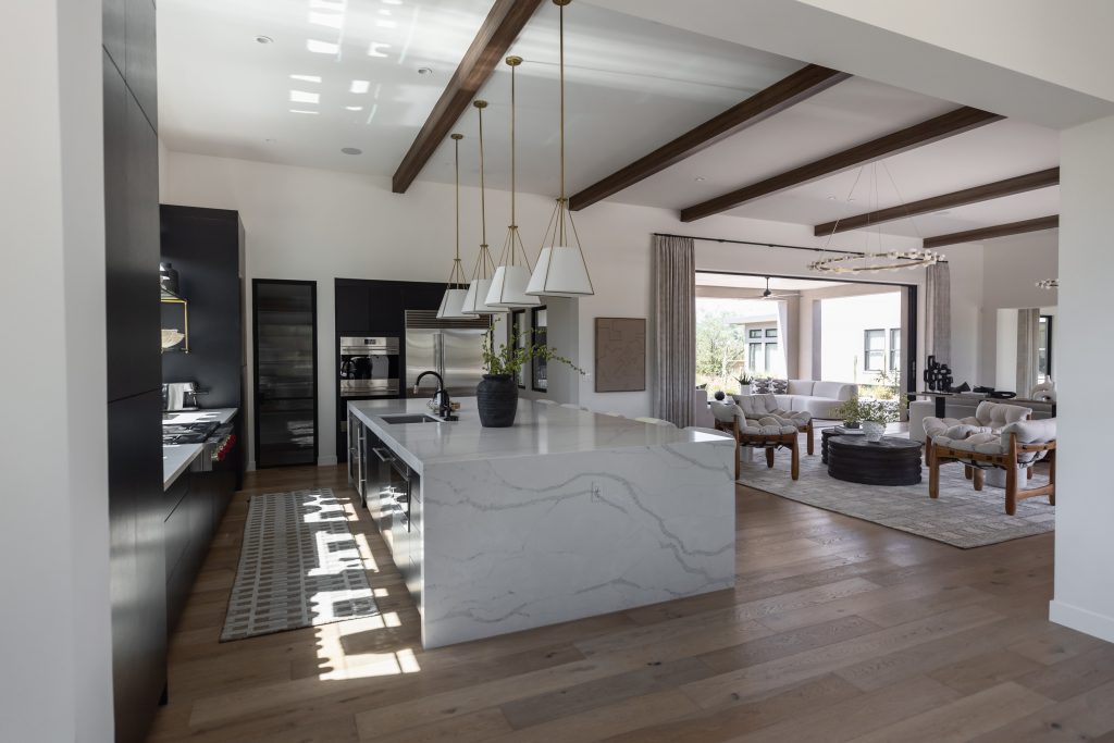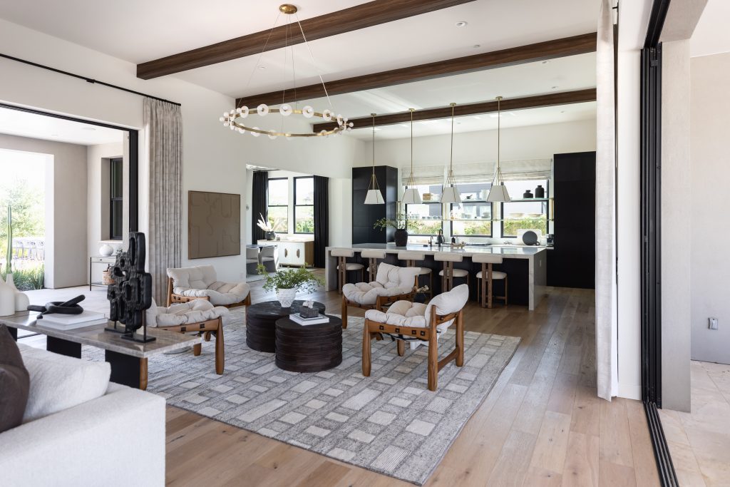 - Scope: Family room (714 sq ft), kitchen lounge area (360 sq ft), entry styling, custom beam treatment