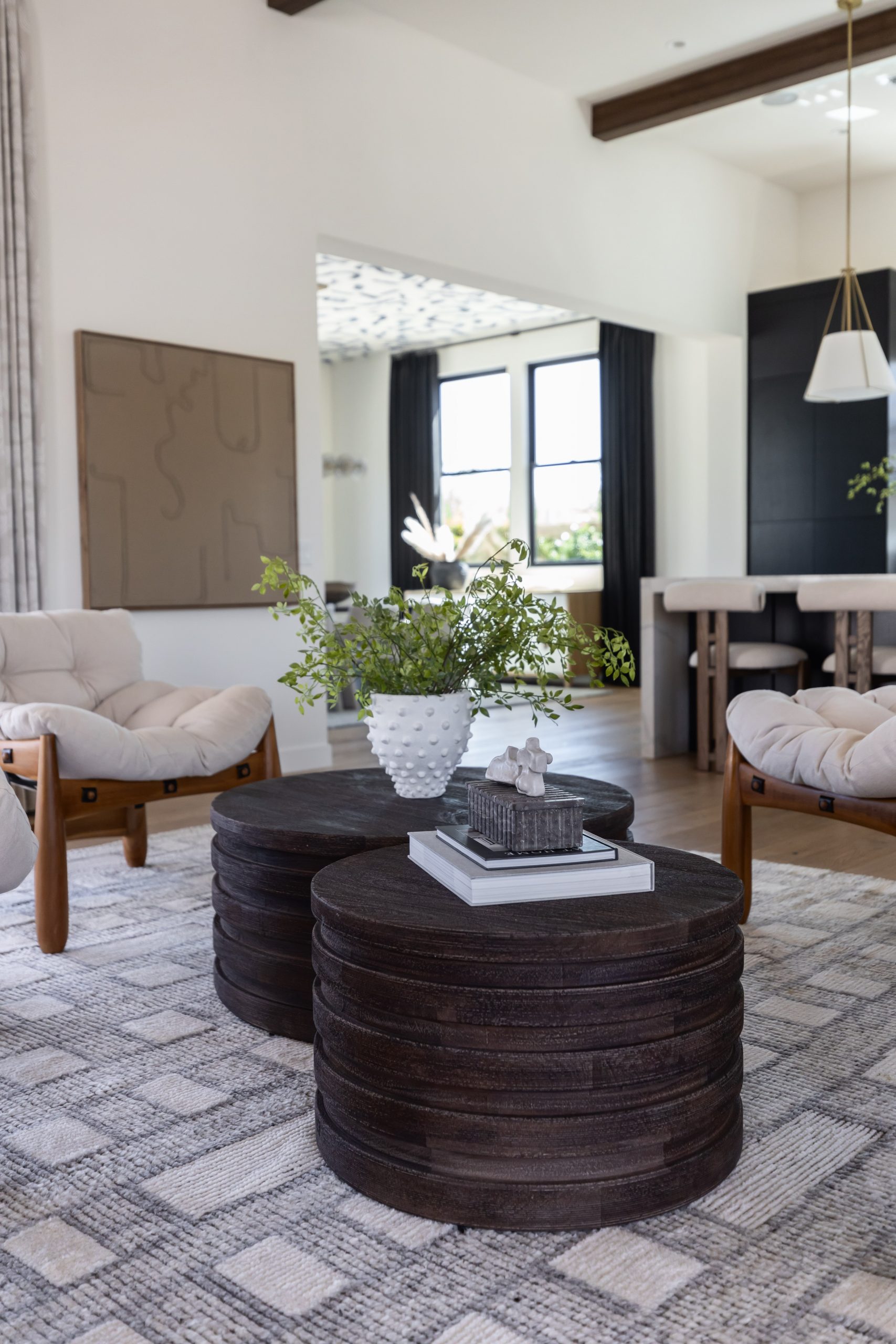 The transformed family room now features rich, organic materials and sophisticated color palette. Custom upholstered walnut chairs serve as sculptural art pieces, while the dual-scale coffee table arrangement in textured mango wood adds unexpected visual interest and functionality for this active family.