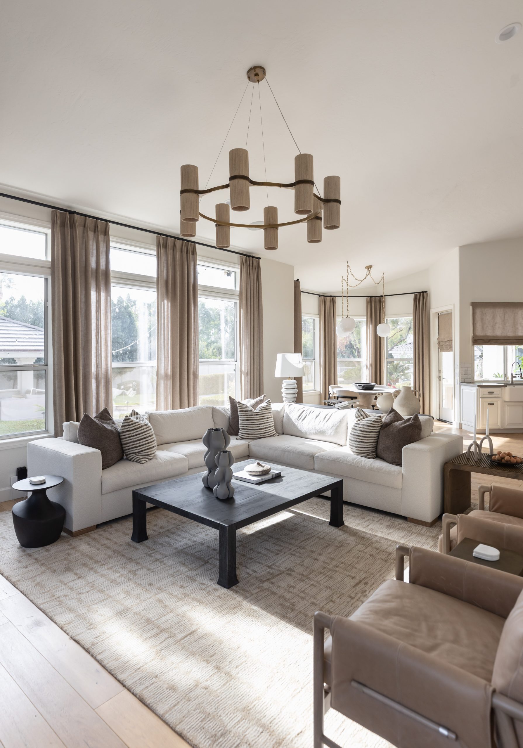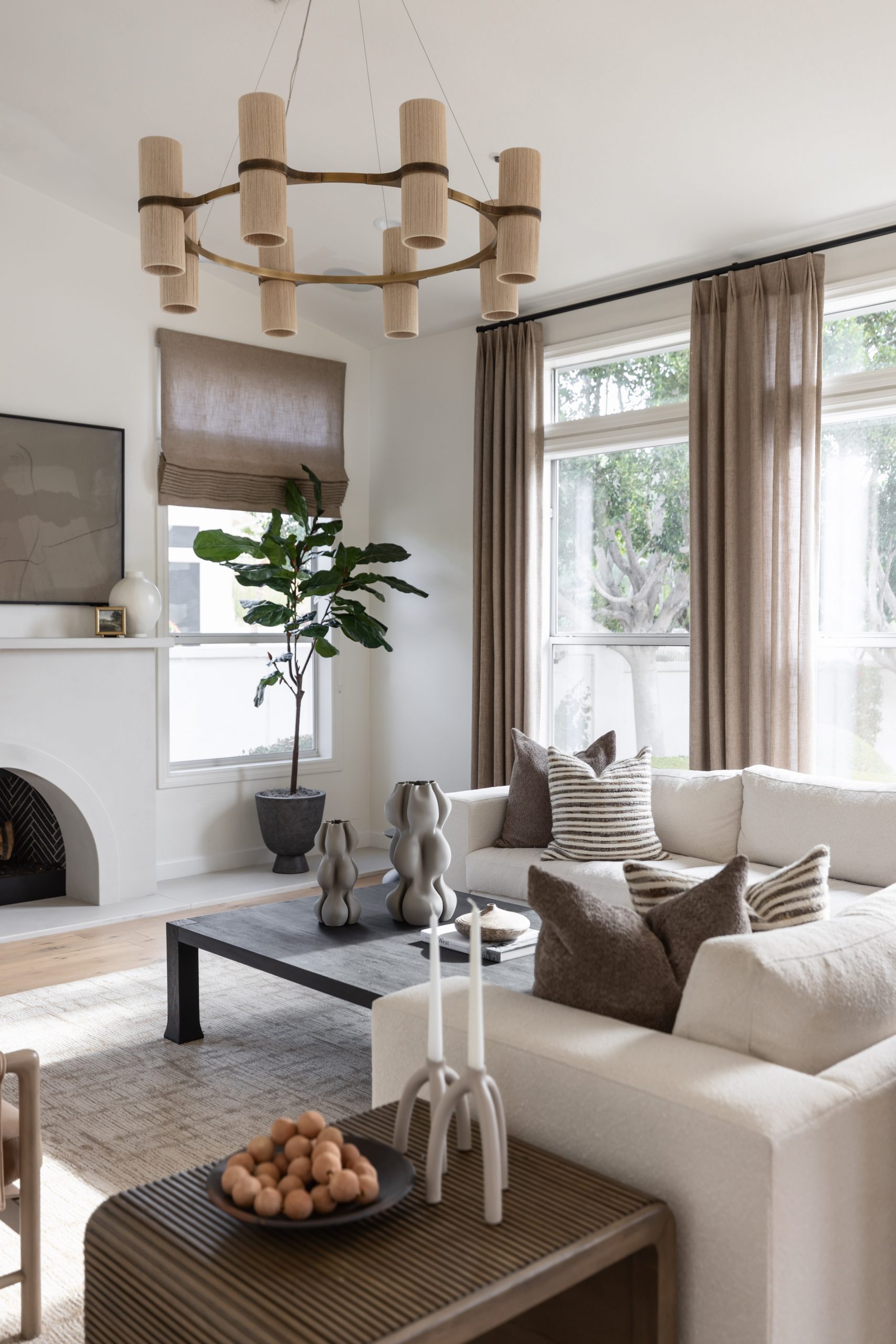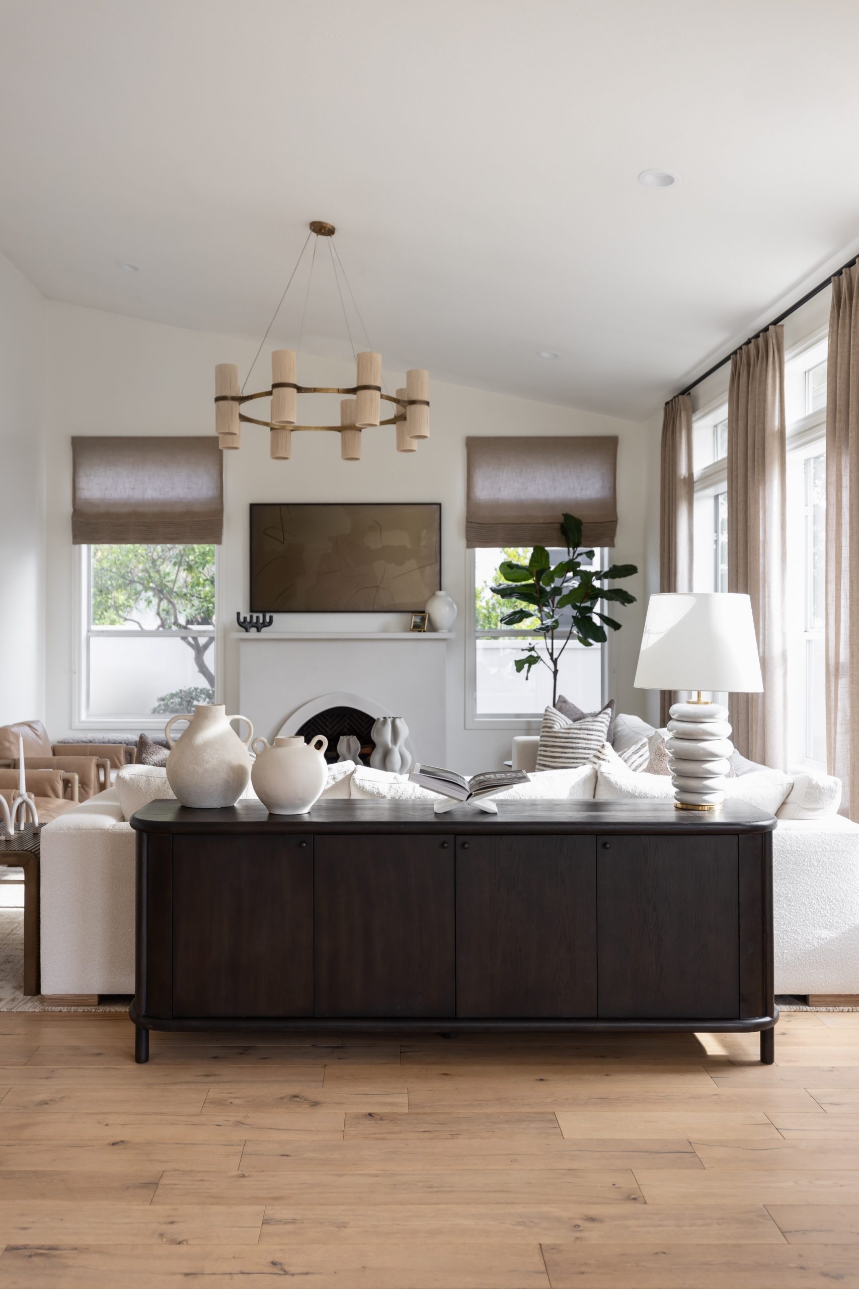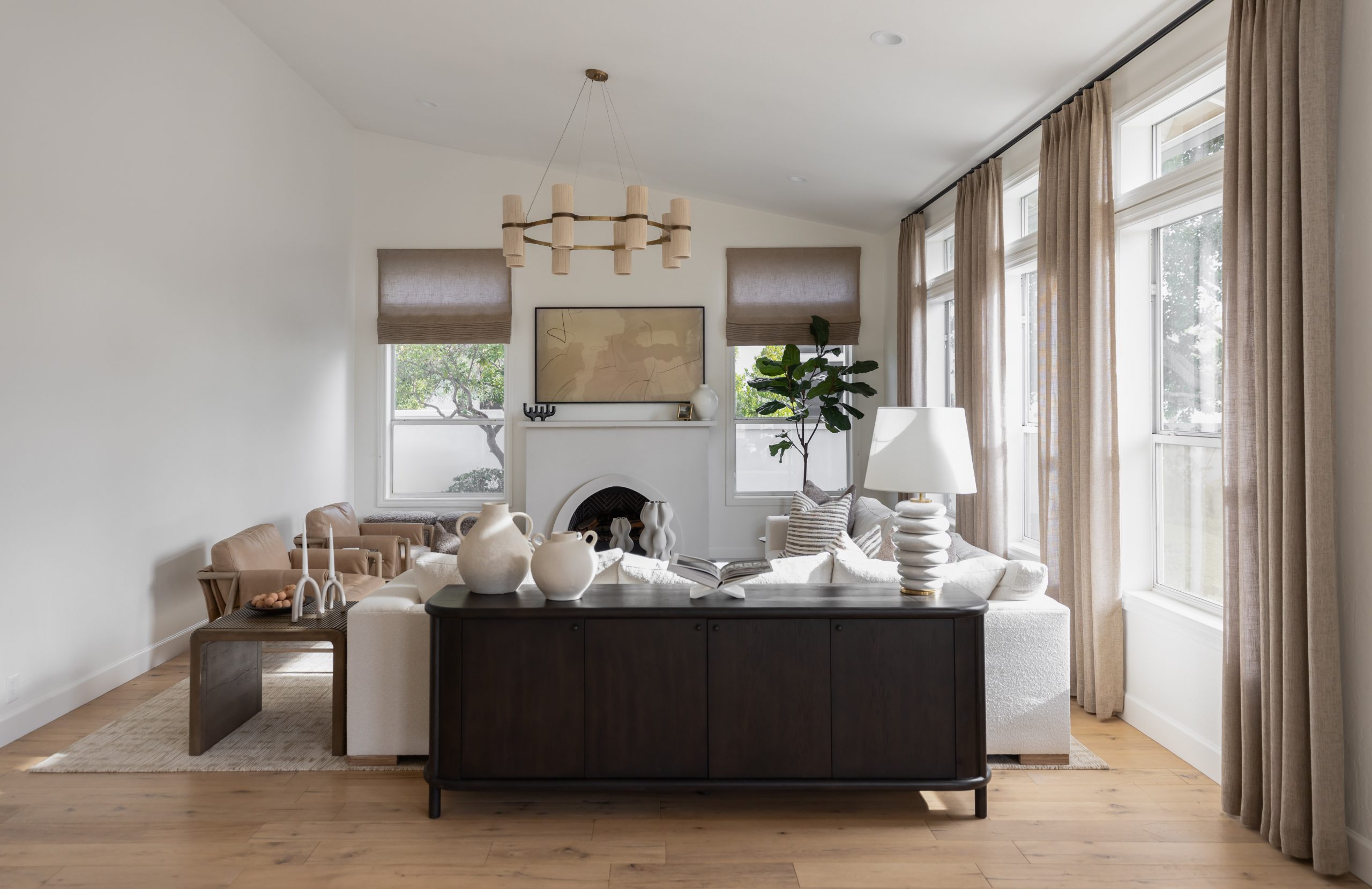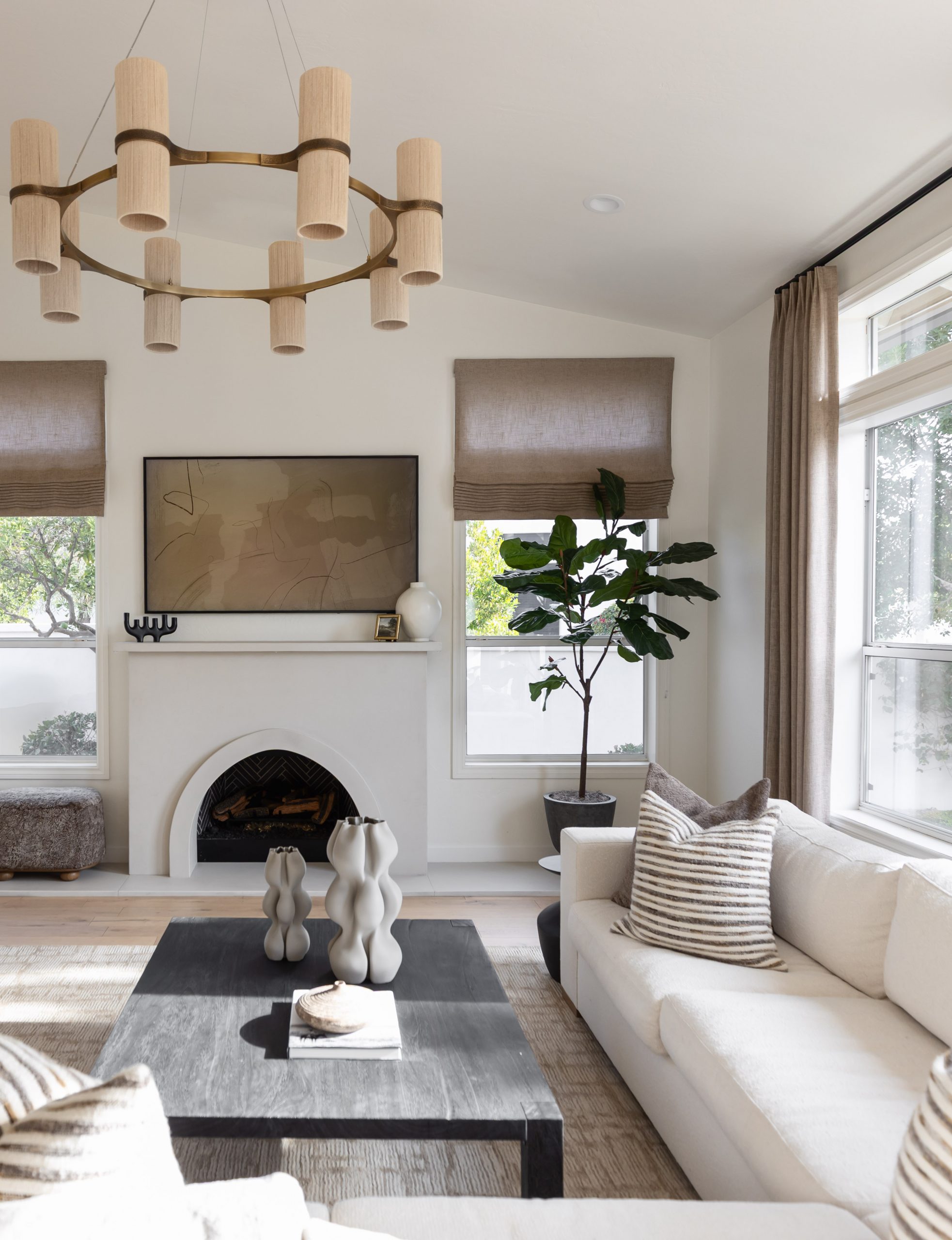 This once builder-grade living room was transformed into a layered, serene retreat grounded in warmth and architectural intention. The fireplace was simplified with a clean-lined surround and curated mantel styling, while custom window treatments add softness and depth. A sculptural light fixture now anchors the vaulted ceiling, and a rich wood console introduces contrast against the lighter upholstery, creating balance and visual weight. Thoughtfully selected furnishings, organic ceramics, and layered textiles warm the previously stark space, resulting in a cohesive, modern environment that feels elevated yet inviting for both relaxed family living and effortless entertaining.