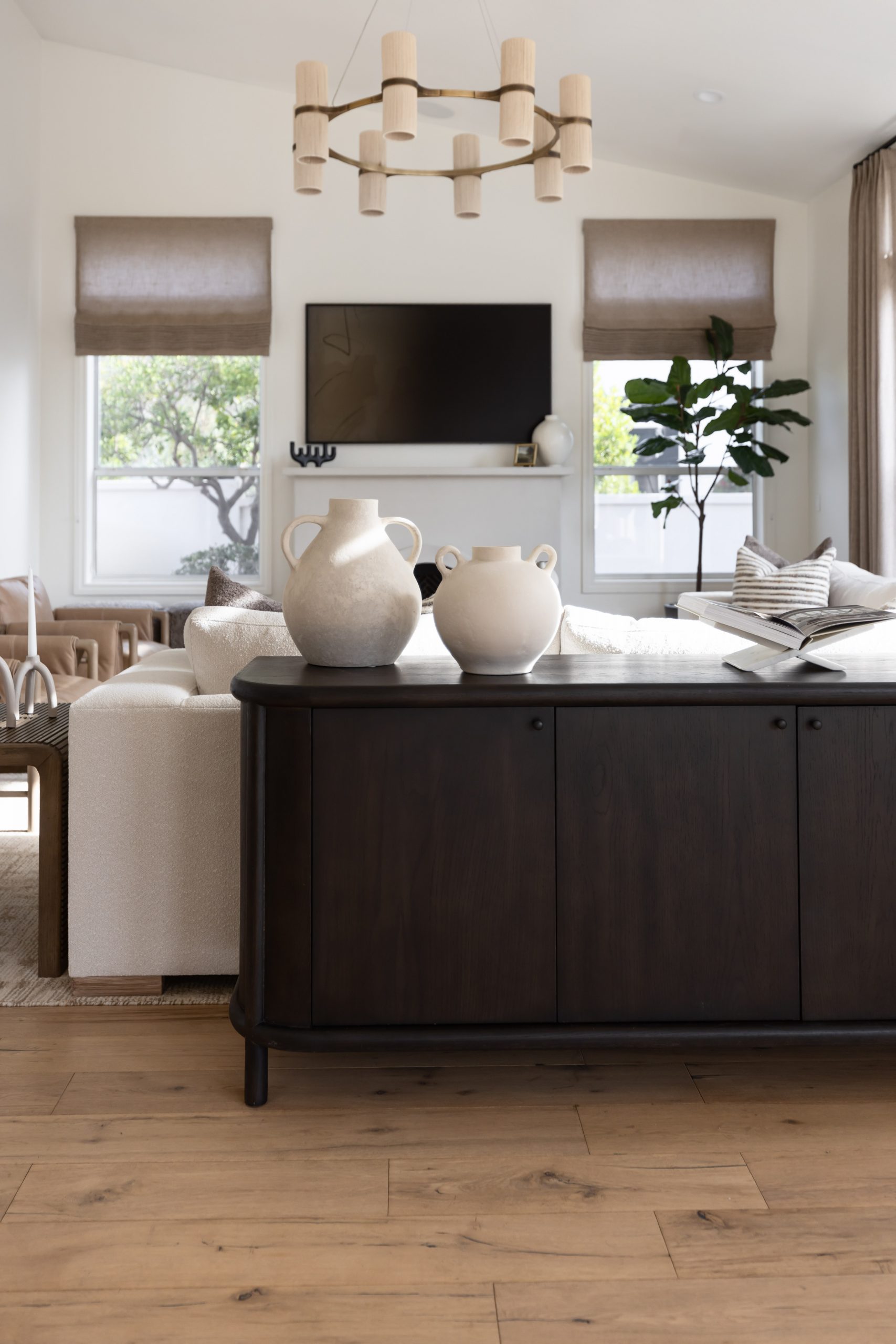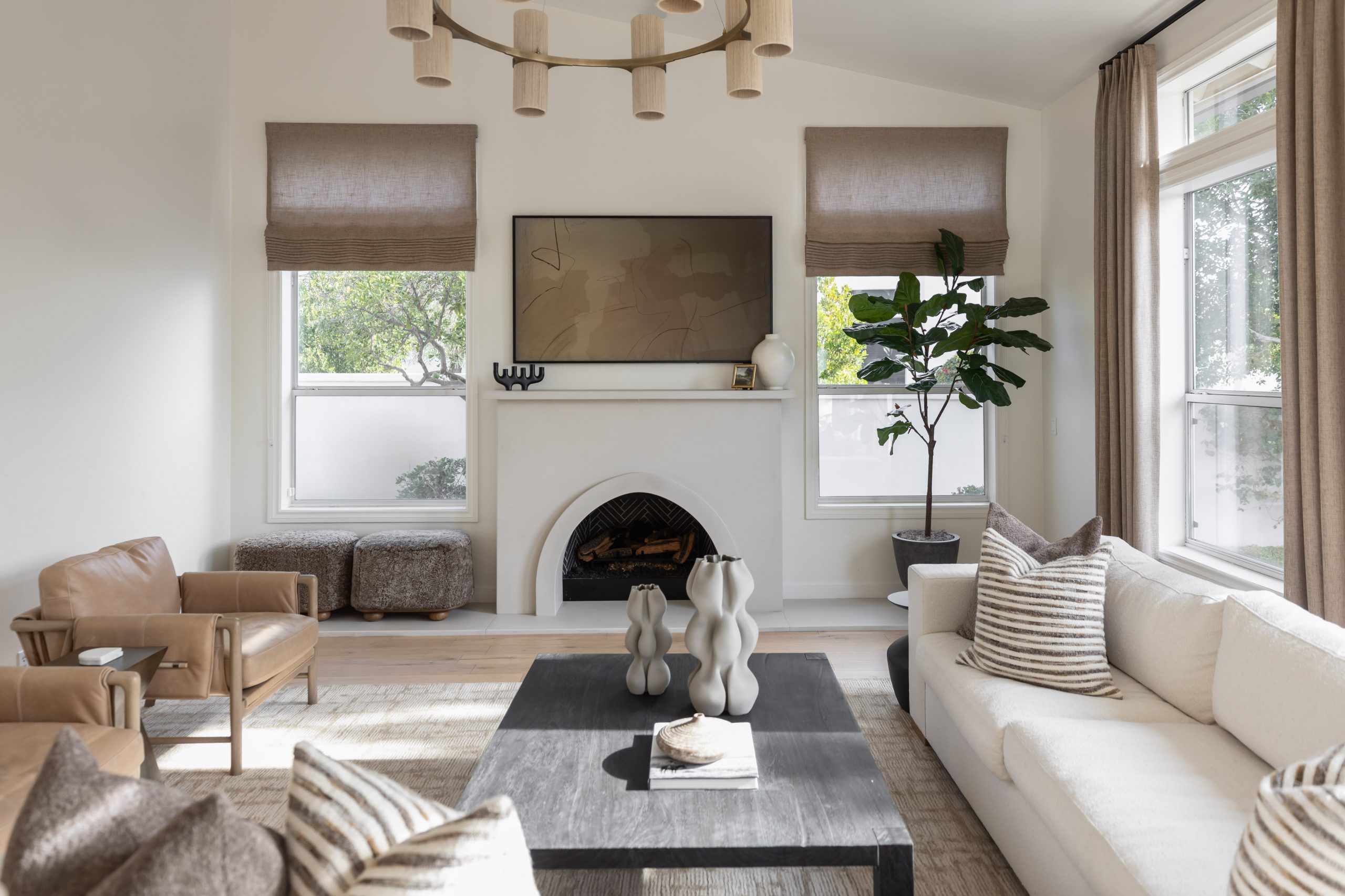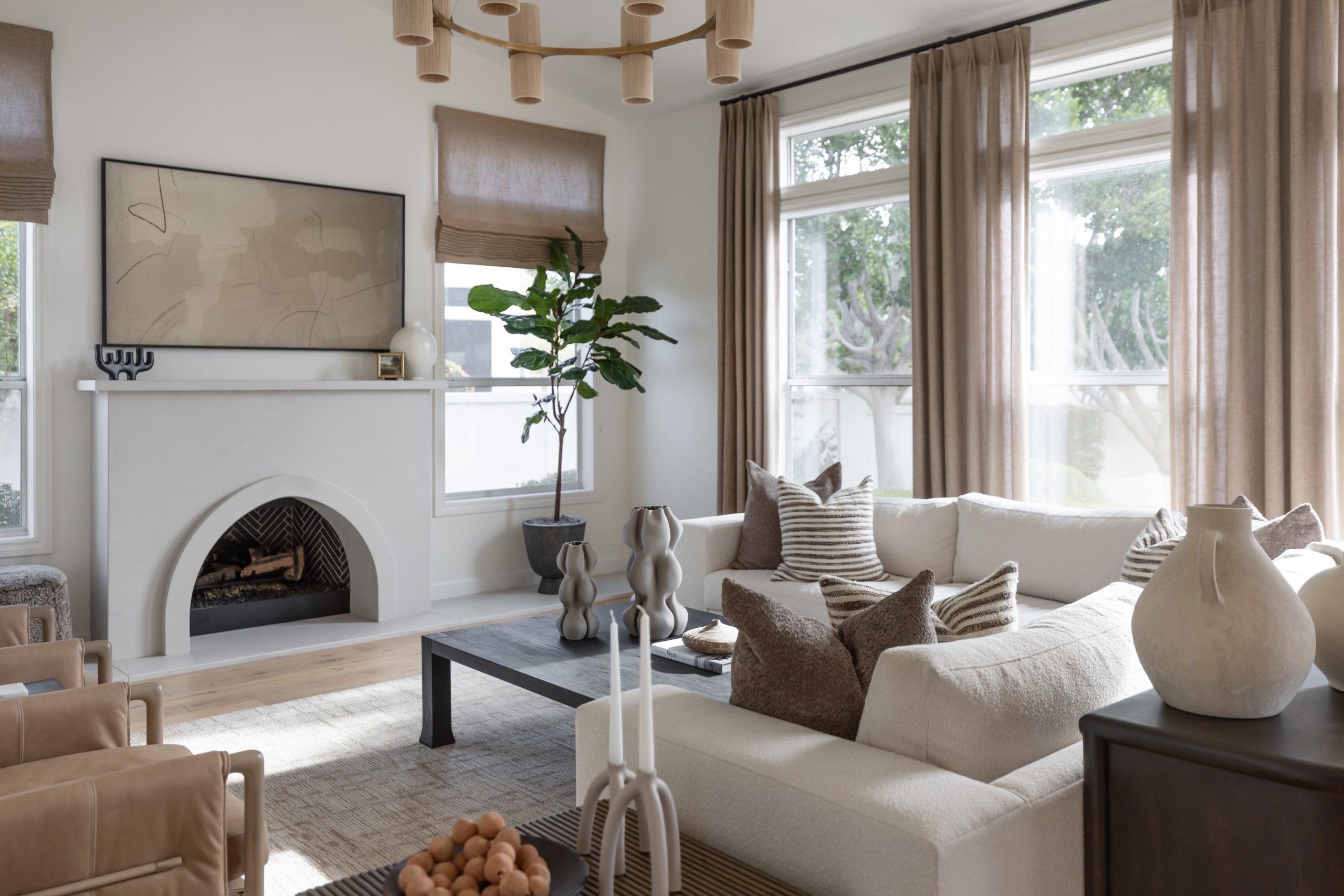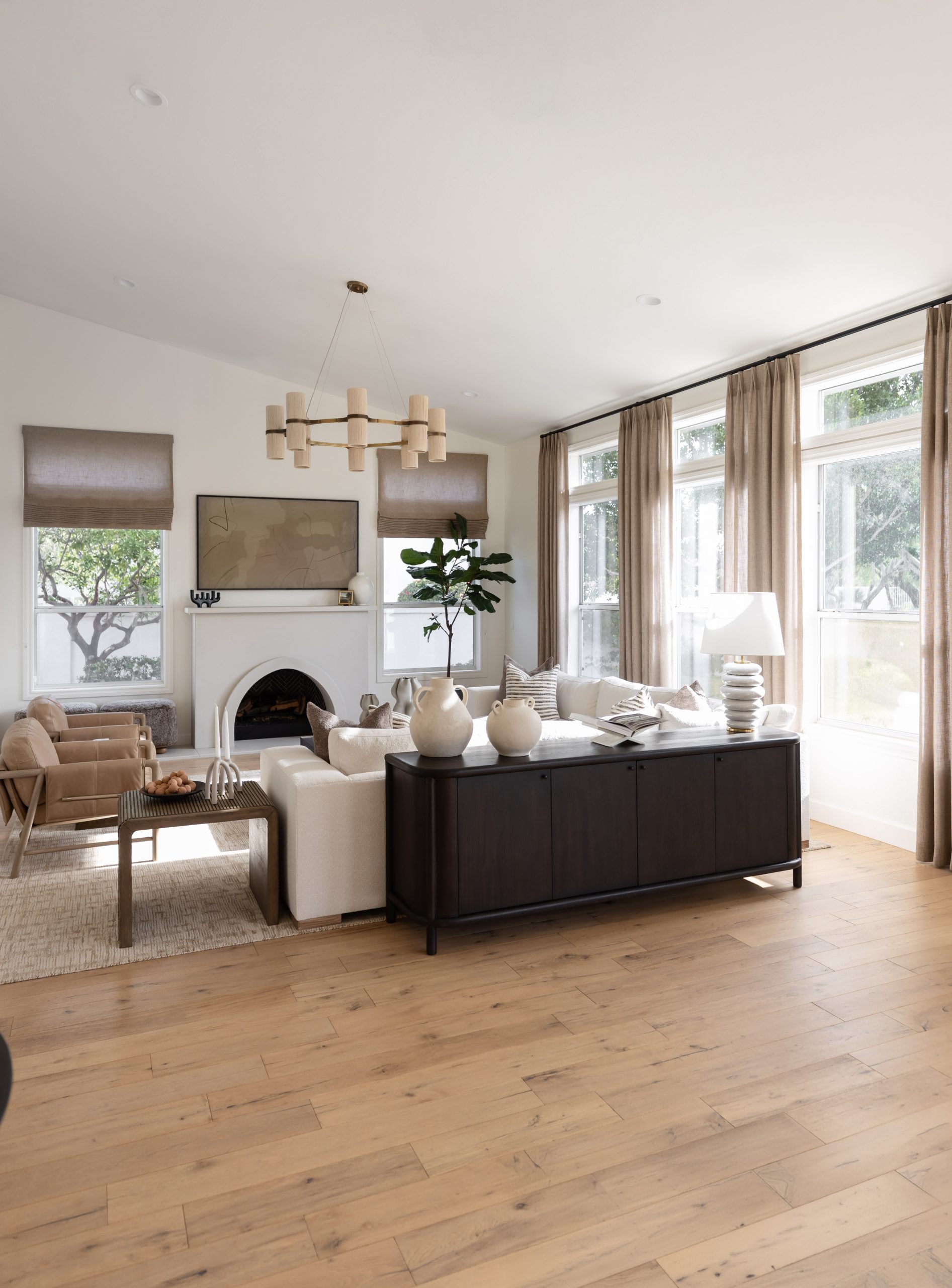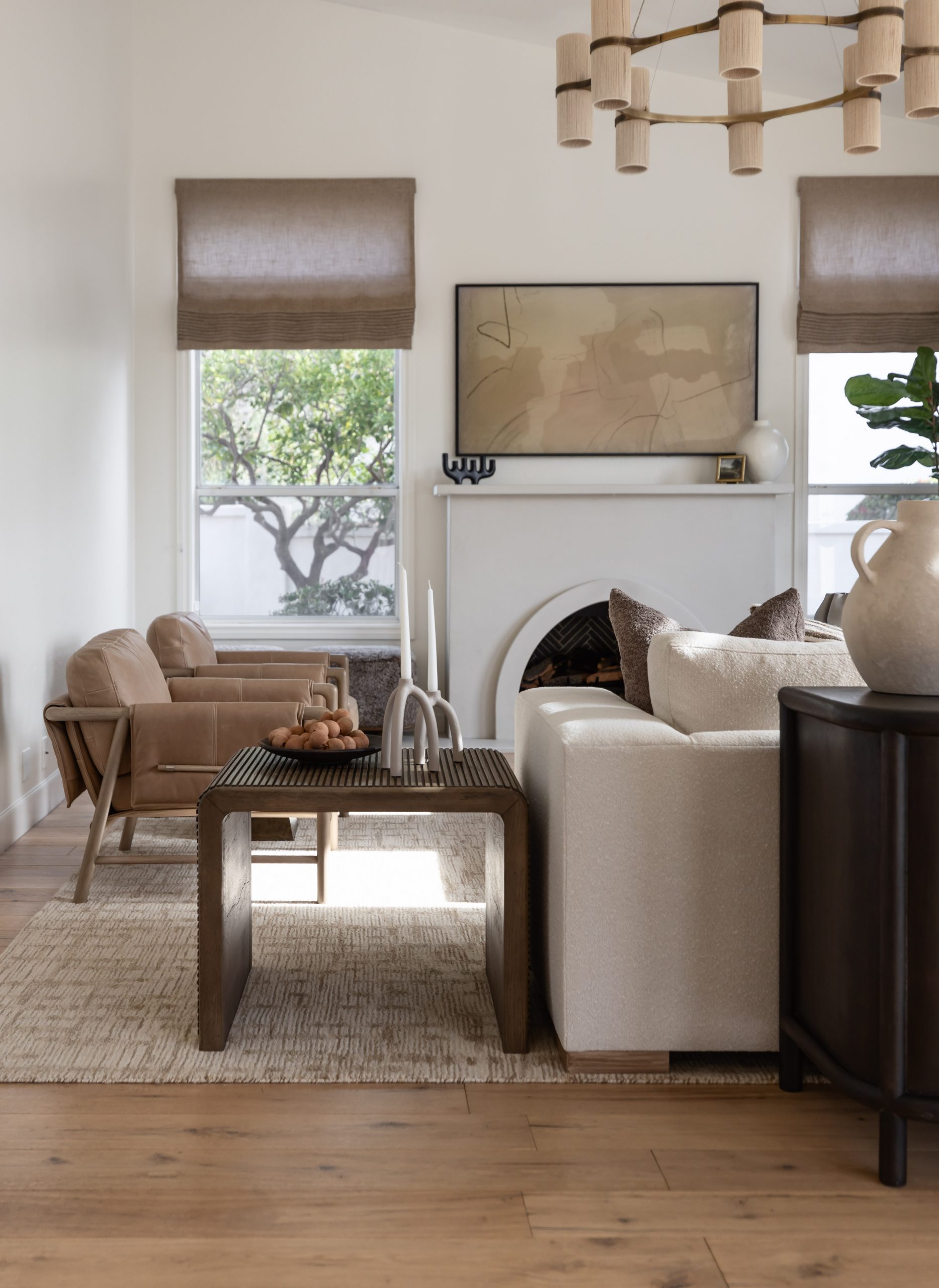 This once builder-grade living room was transformed into a layered, serene retreat grounded in warmth and architectural intention. The fireplace was simplified with a clean-lined surround and curated mantel styling, while custom window treatments add softness and depth. A sculptural light fixture now anchors the vaulted ceiling, and a rich wood console introduces contrast against the lighter upholstery, creating balance and visual weight. Thoughtfully selected furnishings, organic ceramics, and layered textiles warm the previously stark space, resulting in a cohesive, modern environment that feels elevated yet inviting for both relaxed family living and effortless entertaining.