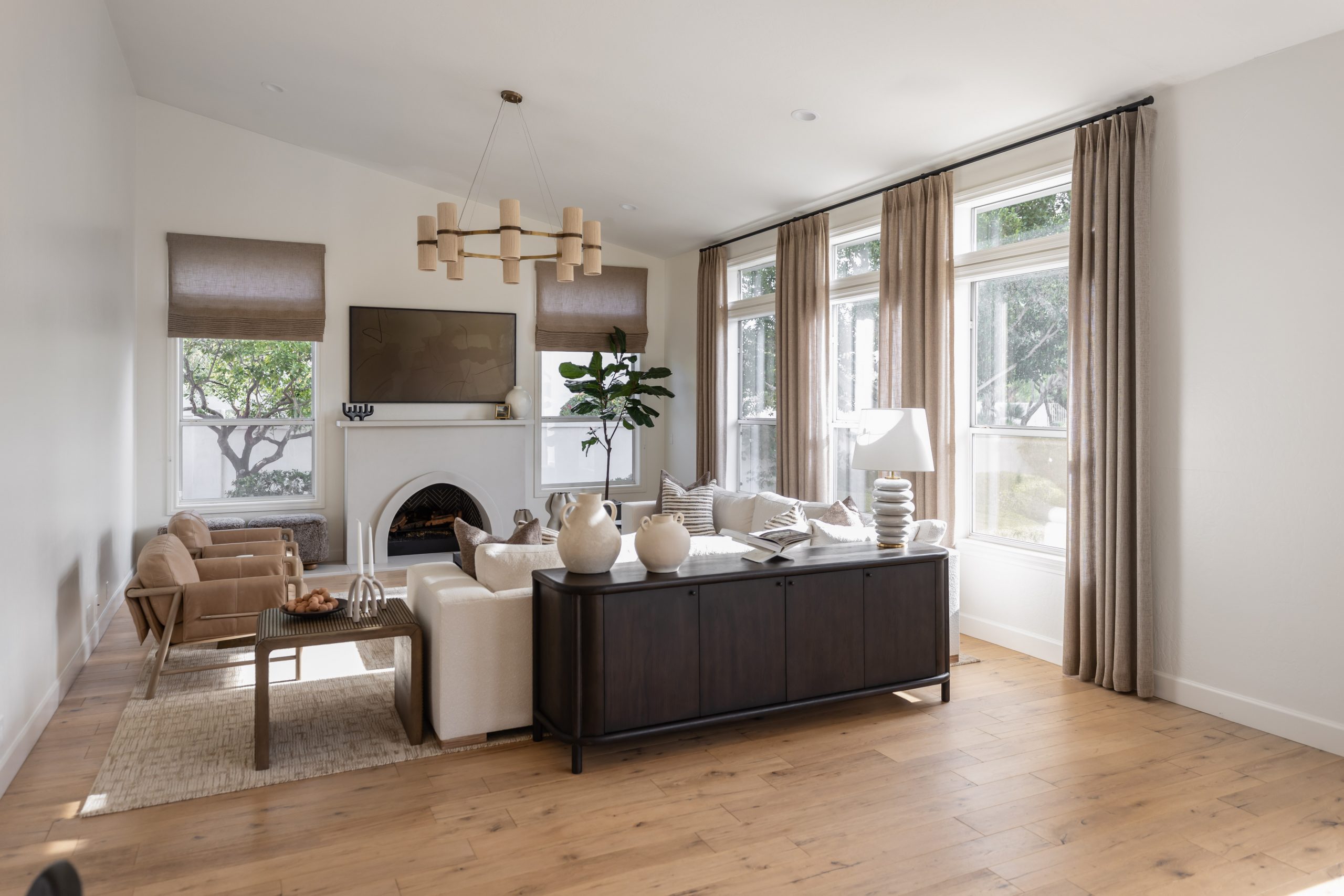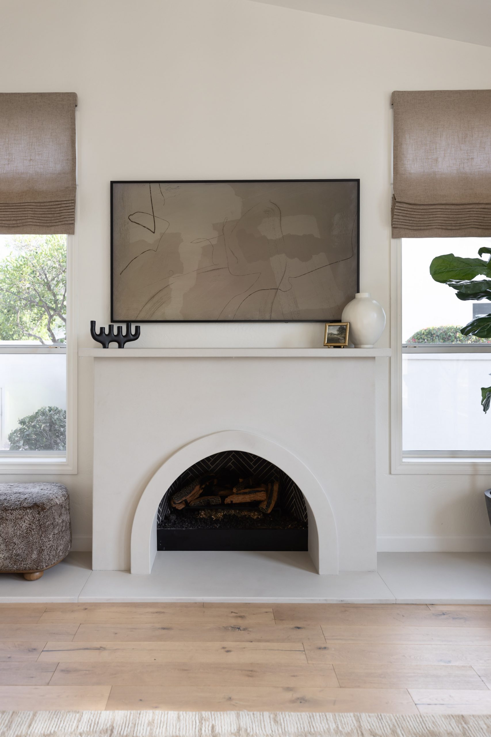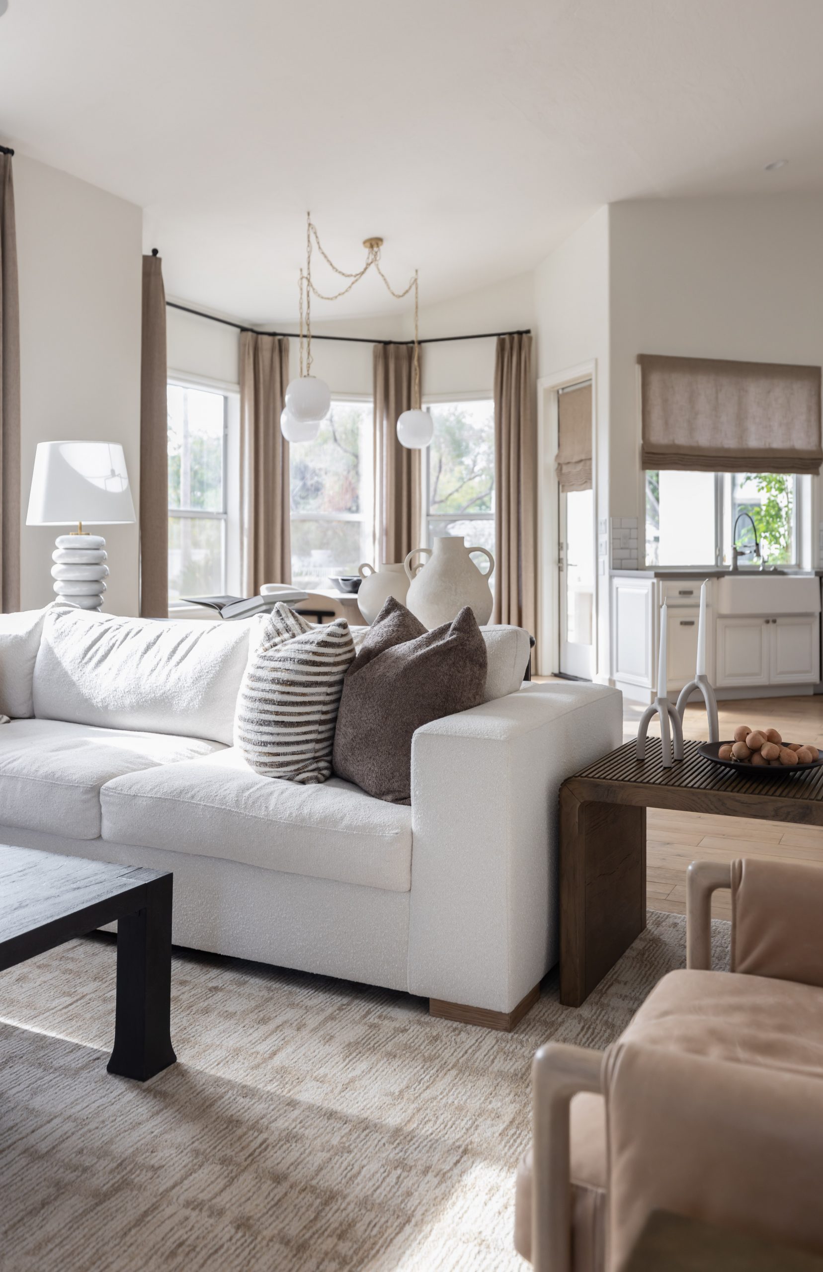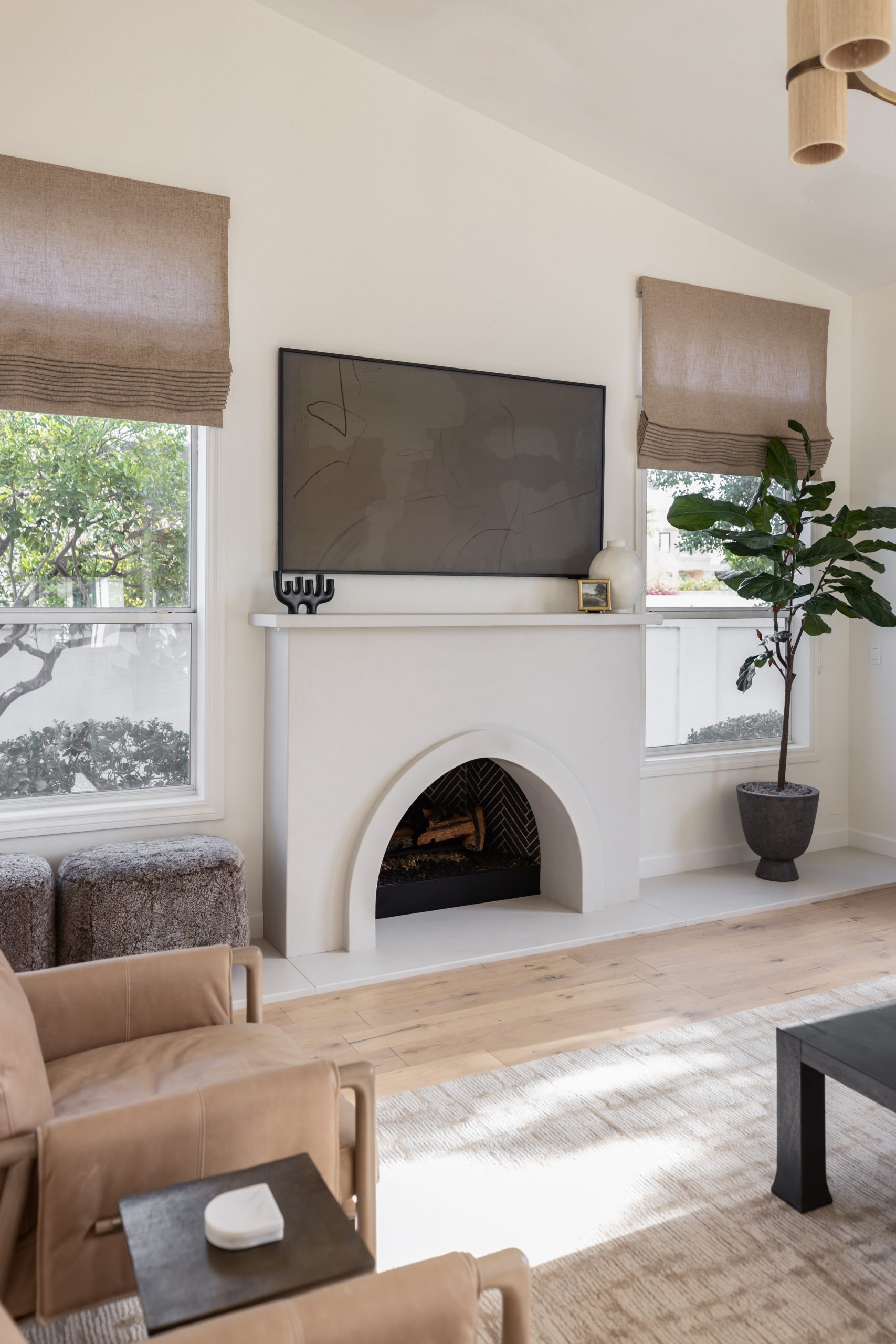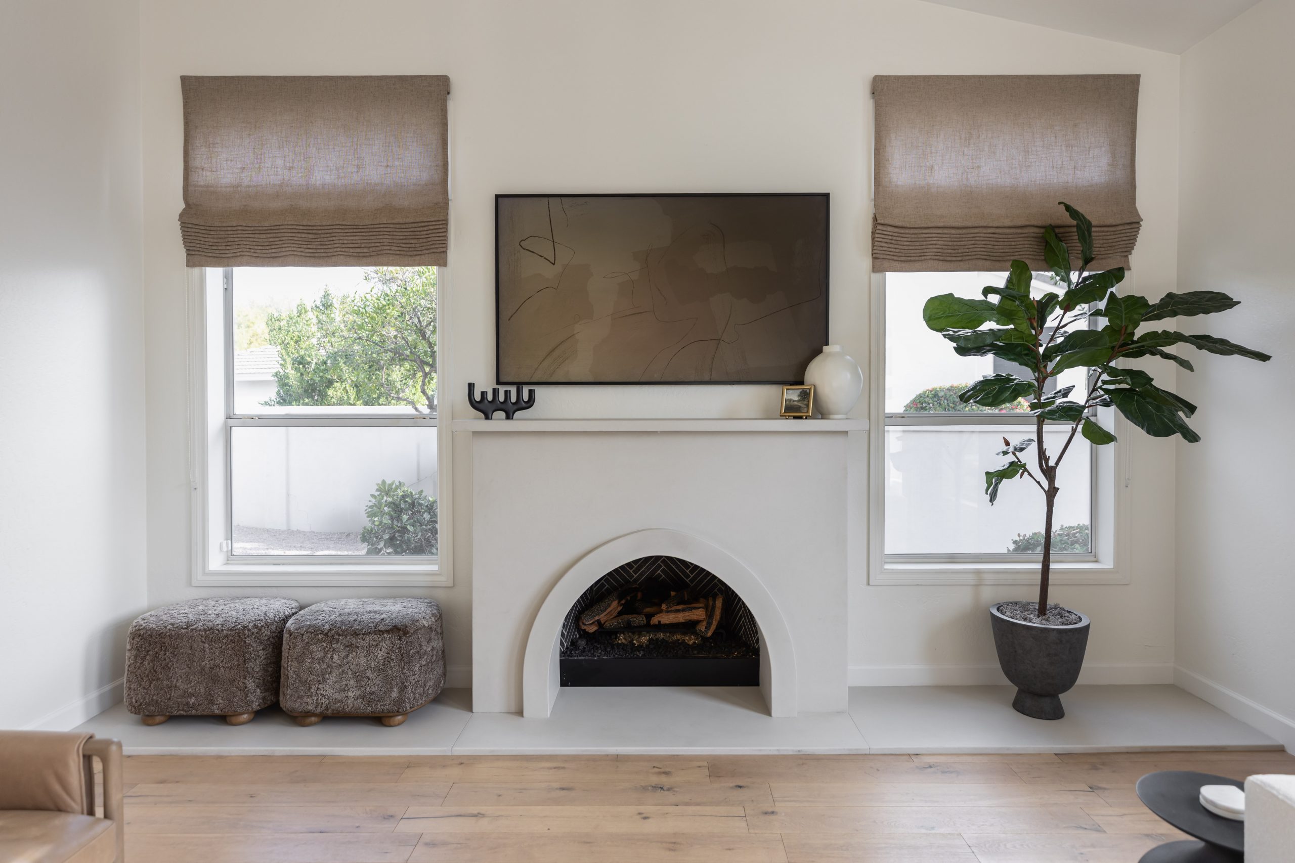 This once builder-grade living room was transformed into a layered, serene retreat grounded in warmth and architectural intention. The fireplace was simplified with a clean-lined surround and curated mantel styling, while custom window treatments add softness and depth. A sculptural light fixture now anchors the vaulted ceiling, and a rich wood console introduces contrast against the lighter upholstery, creating balance and visual weight. Thoughtfully selected furnishings, organic ceramics, and layered textiles warm the previously stark space, resulting in a cohesive, modern environment that feels elevated yet inviting for both relaxed family living and effortless entertaining.