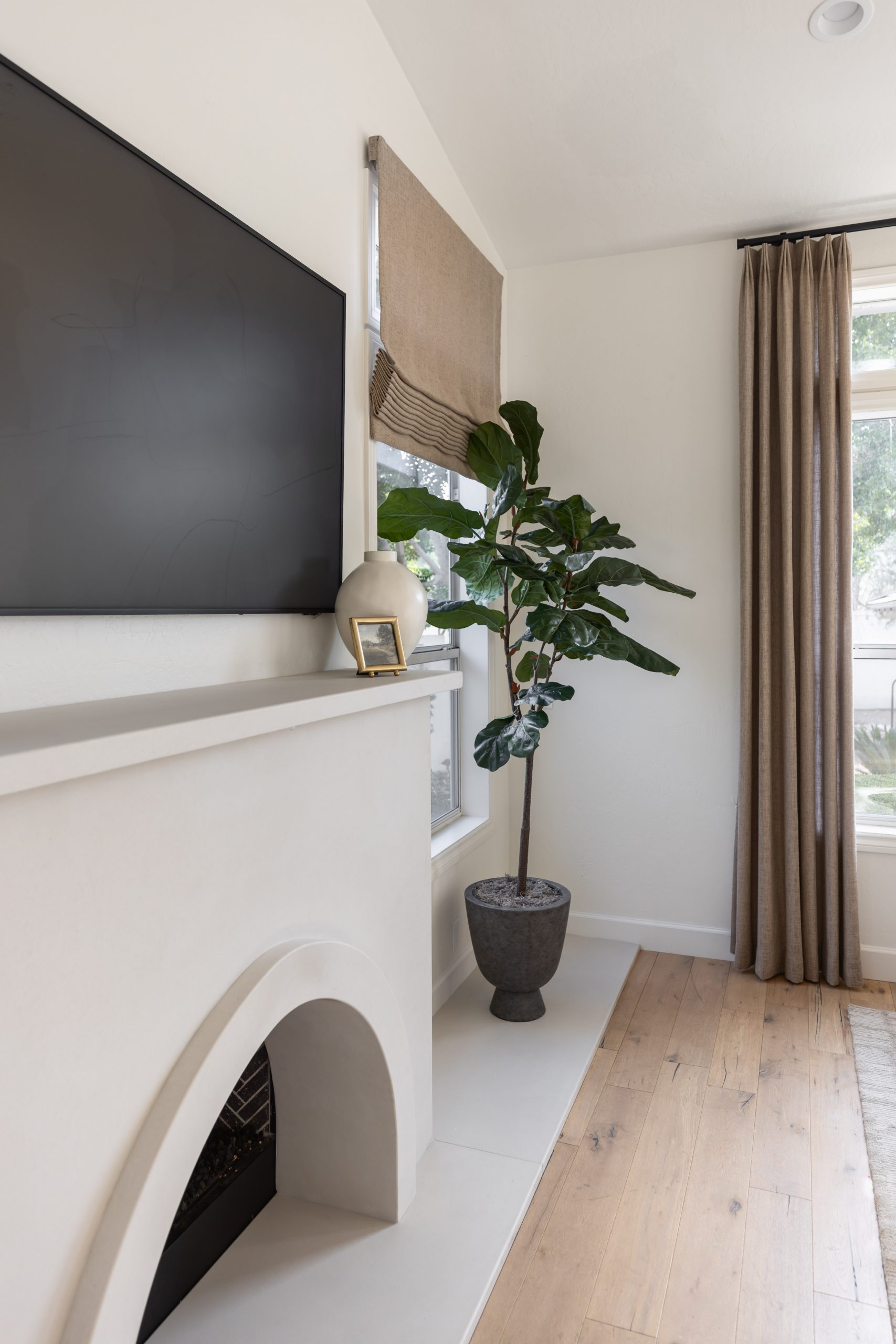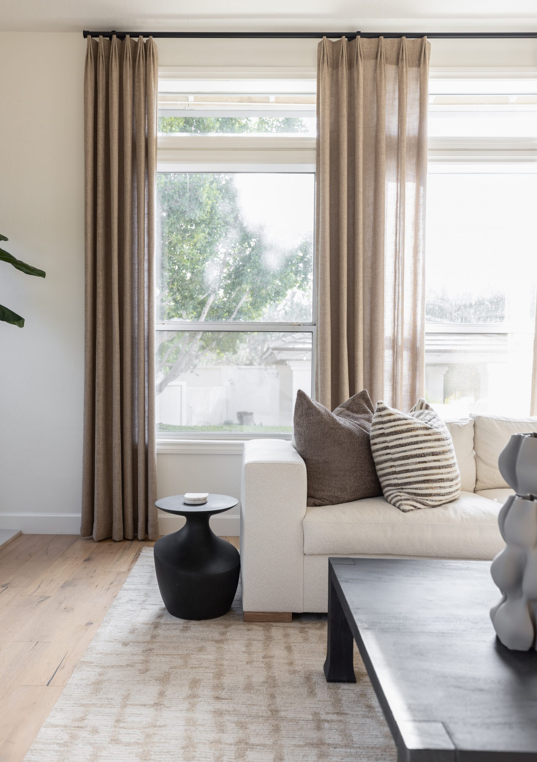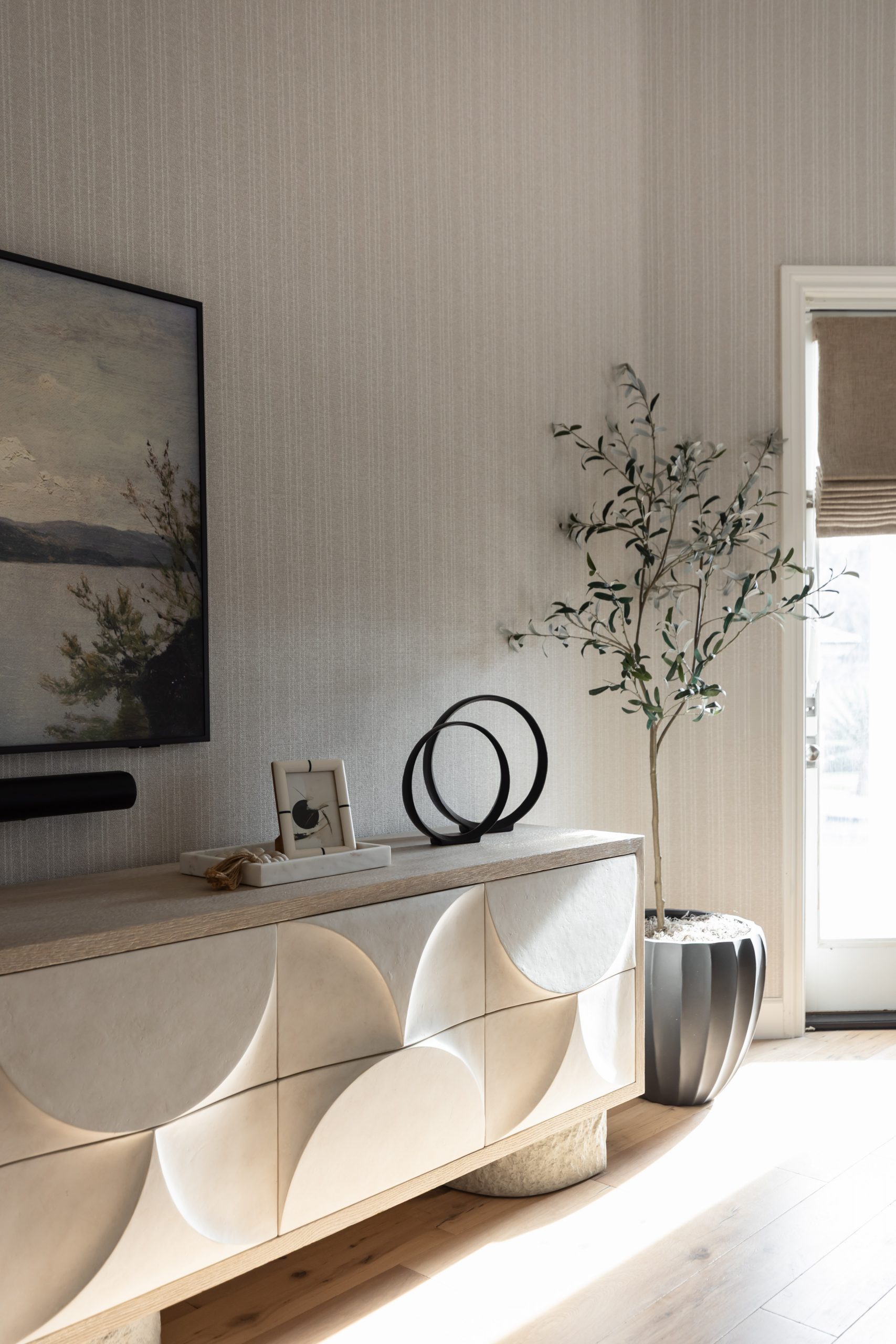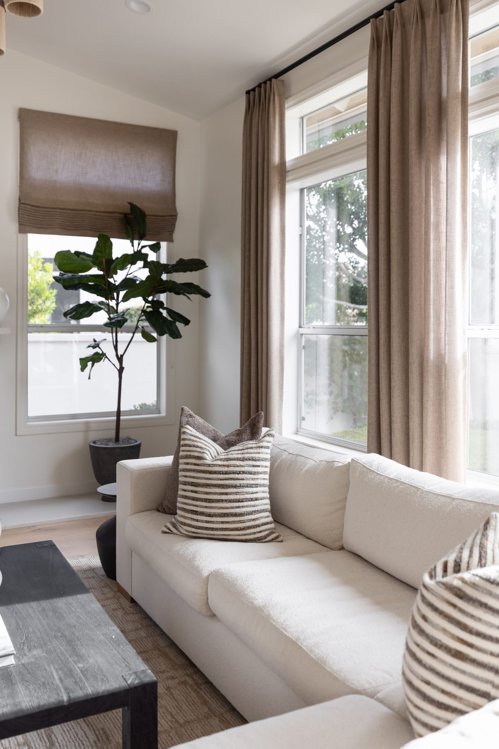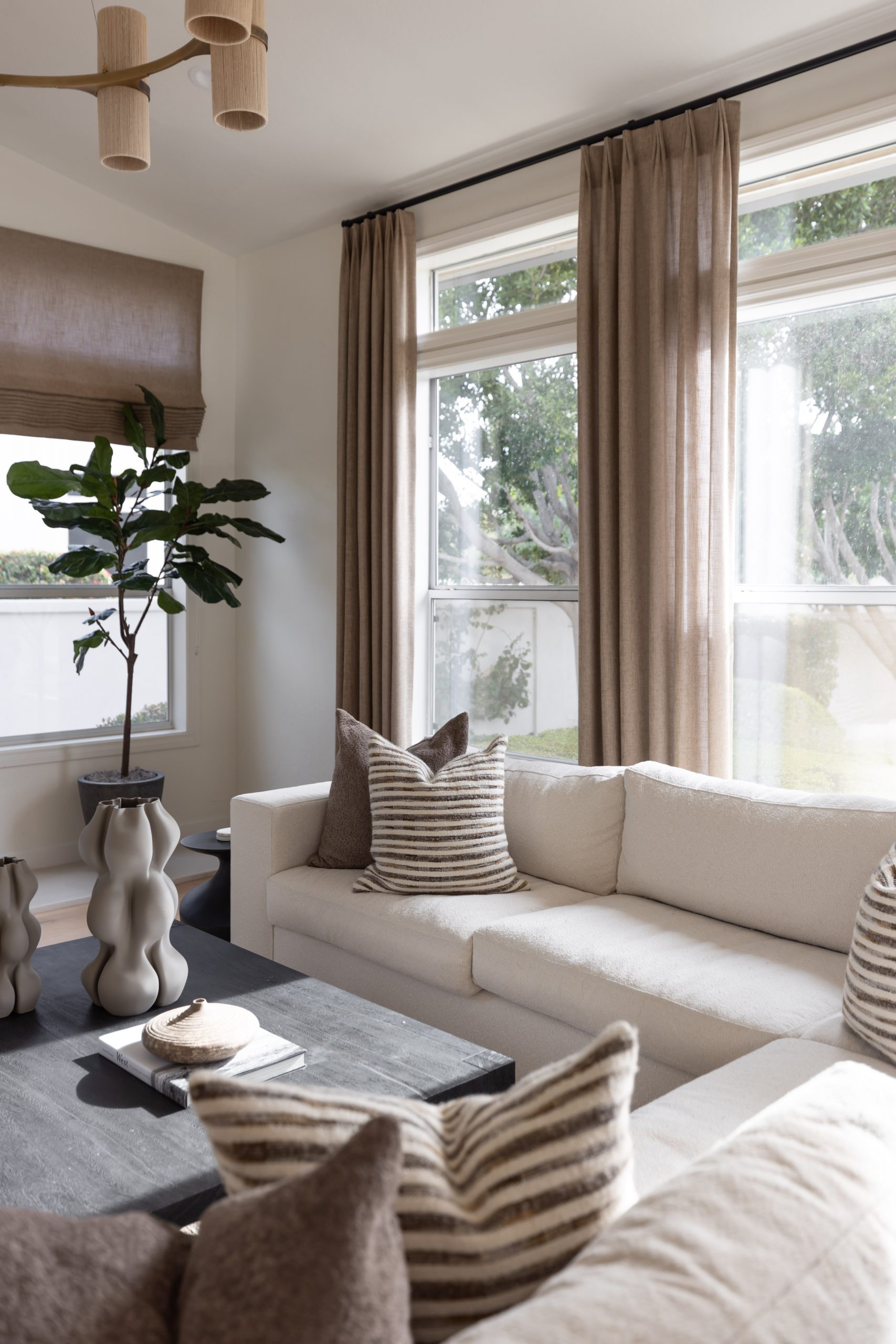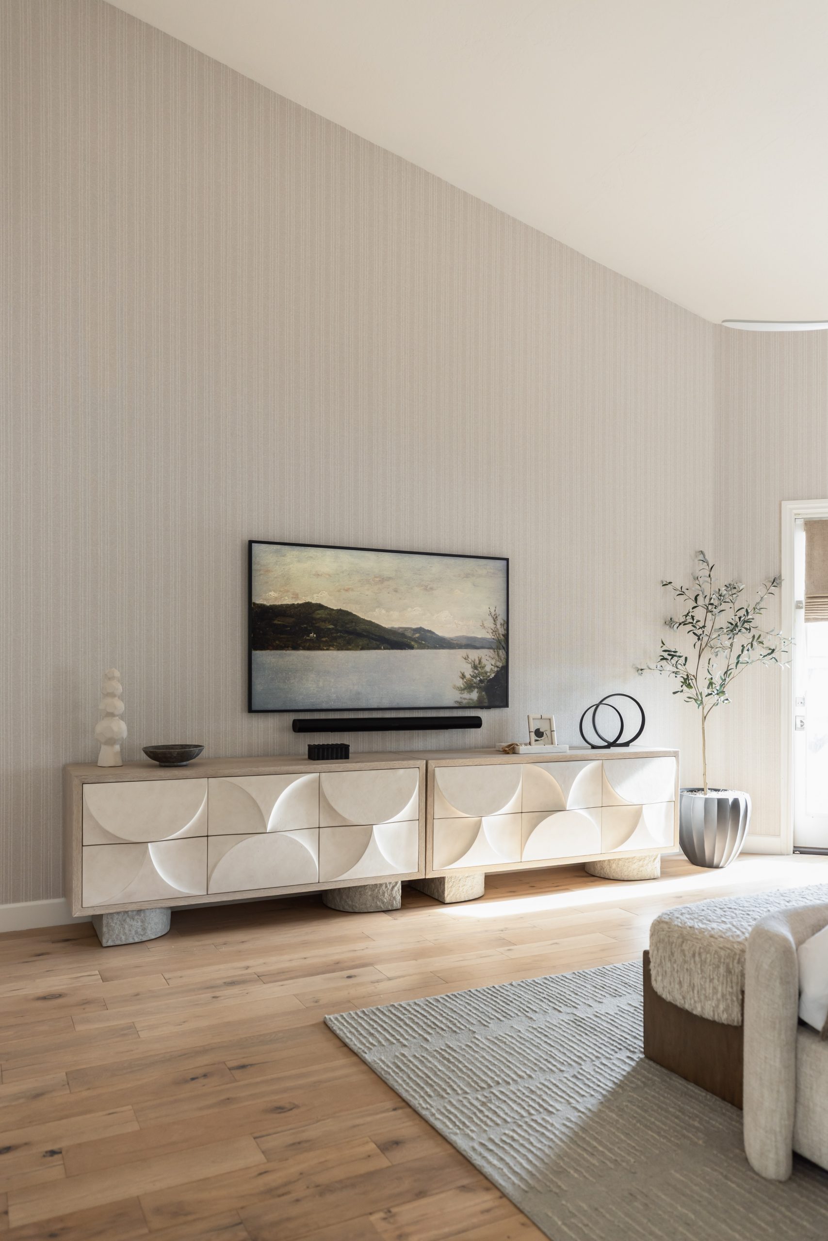 This once builder-grade living room was transformed into a layered, serene retreat grounded in warmth and architectural intention. The fireplace was simplified with a clean-lined surround and curated mantel styling, while custom window treatments add softness and depth. A sculptural light fixture now anchors the vaulted ceiling, and a rich wood console introduces contrast against the lighter upholstery, creating balance and visual weight. Thoughtfully selected furnishings, organic ceramics, and layered textiles warm the previously stark space, resulting in a cohesive, modern environment that feels elevated yet inviting for both relaxed family living and effortless entertaining.