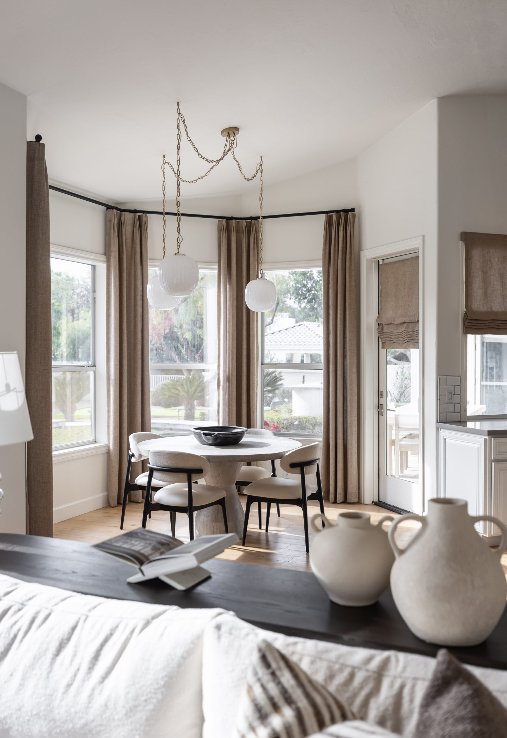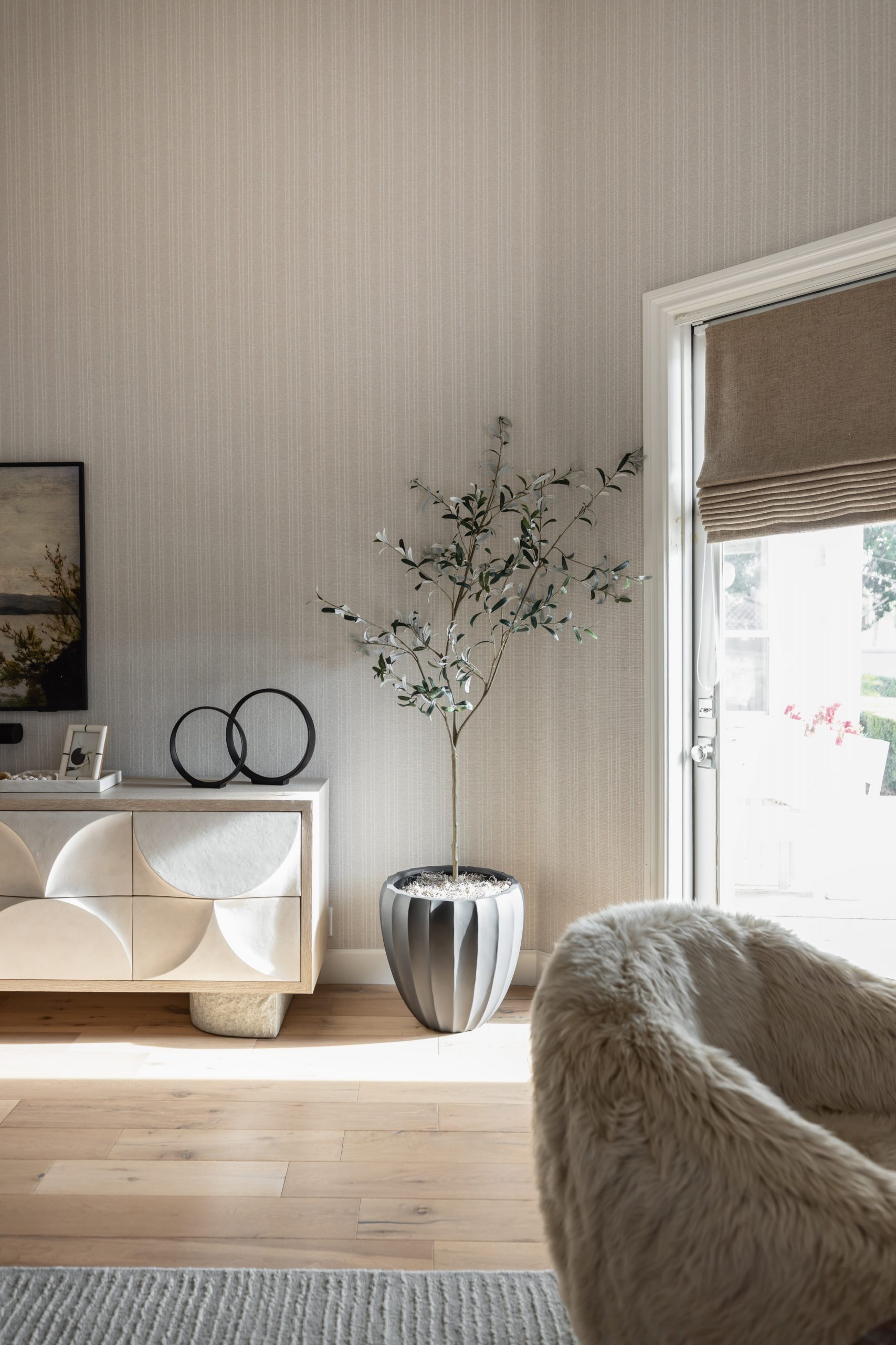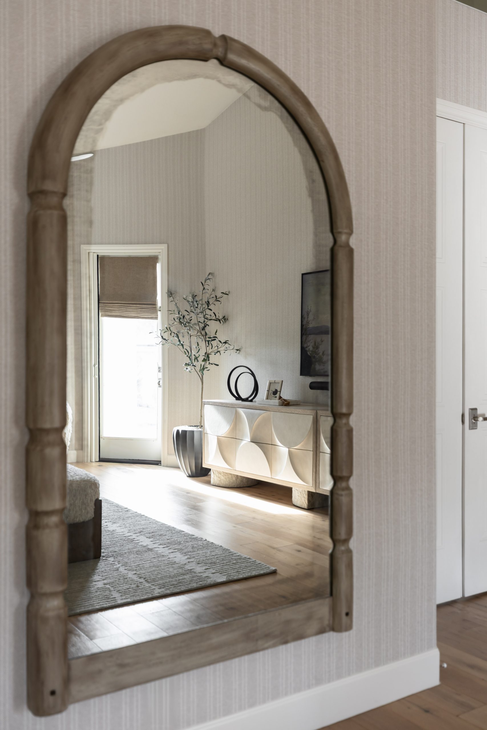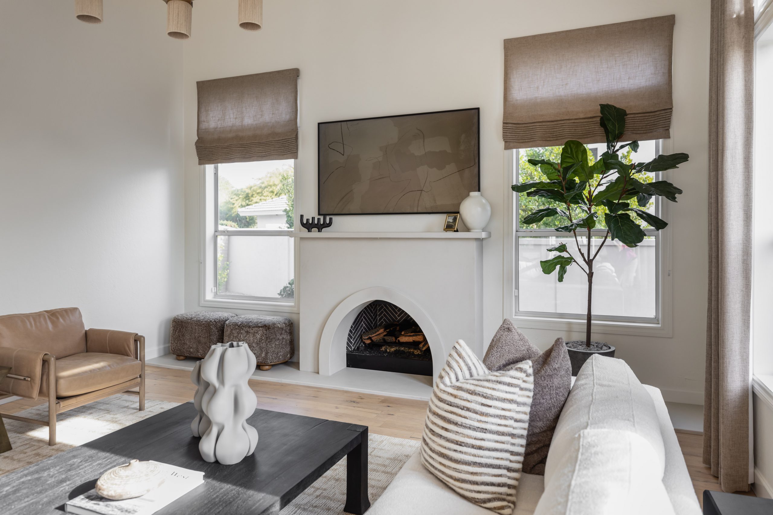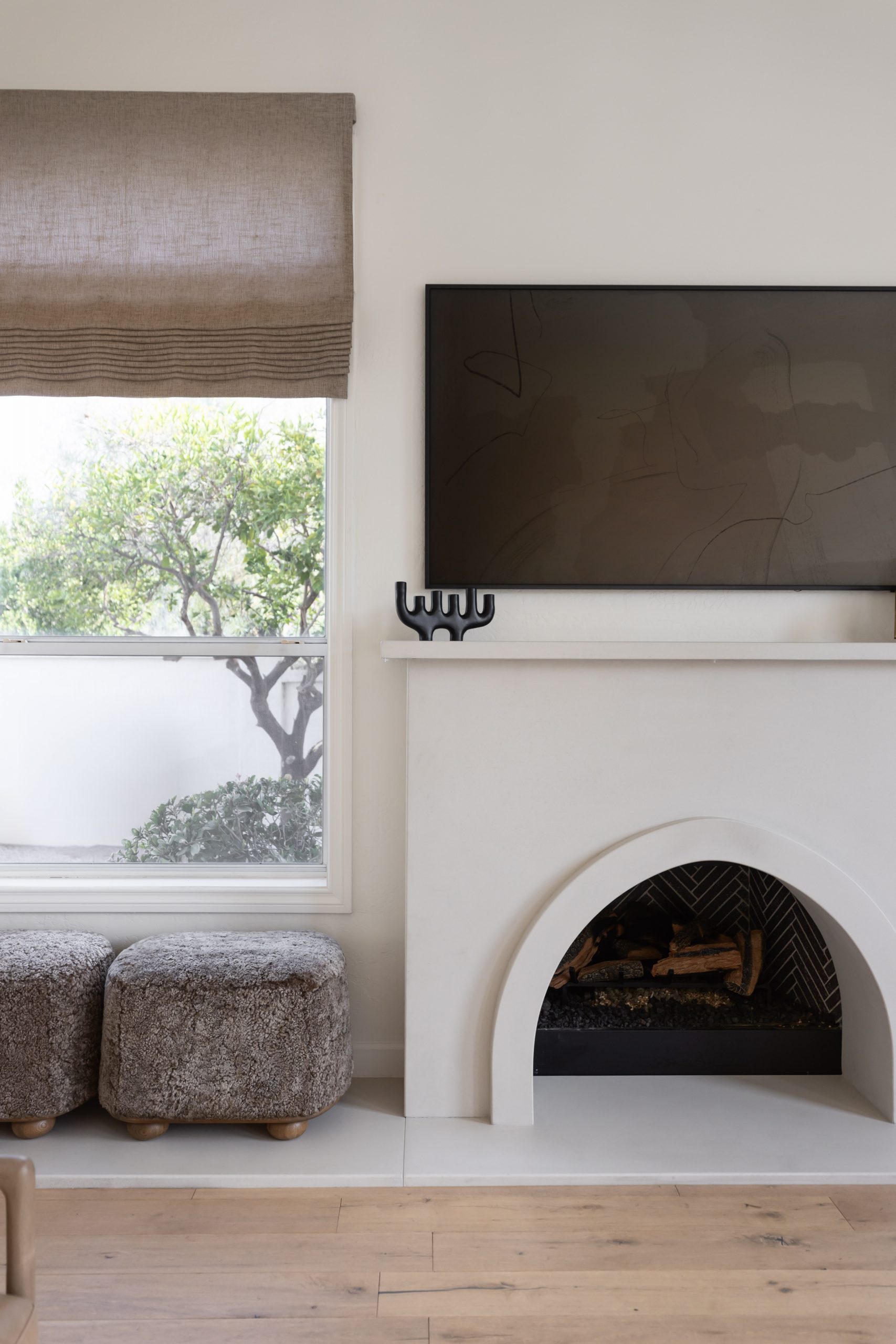This once builder-grade living room was transformed into a layered, serene retreat grounded in warmth and architectural intention. The fireplace was simplified with a clean-lined surround and curated mantel styling, while custom window treatments add softness and depth. A sculptural light fixture now anchors the vaulted ceiling, and a rich wood console introduces contrast against the lighter upholstery, creating balance and visual weight. Thoughtfully selected furnishings, organic ceramics, and layered textiles warm the previously stark space, resulting in a cohesive, modern environment that feels elevated yet inviting for both relaxed family living and effortless entertaining.