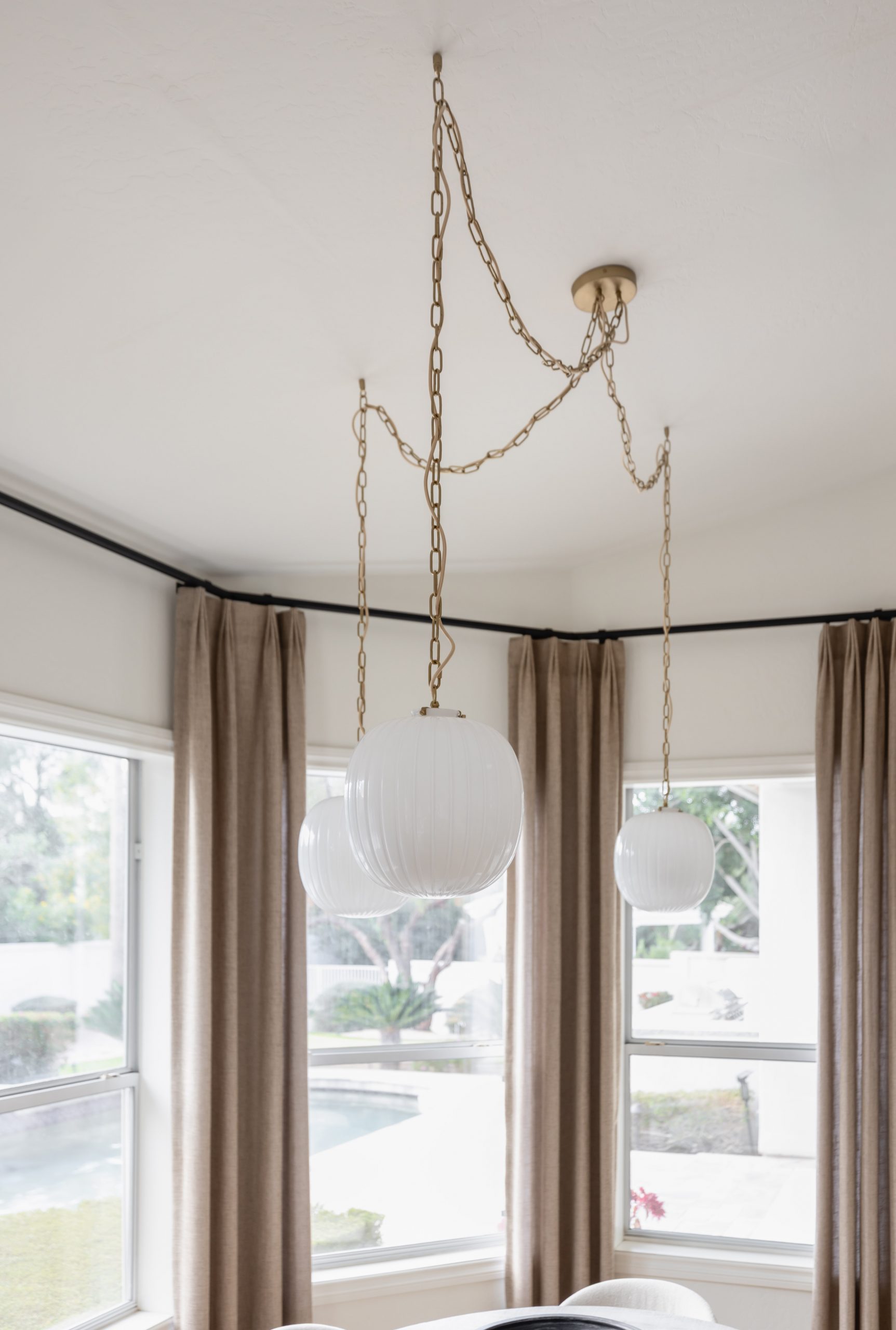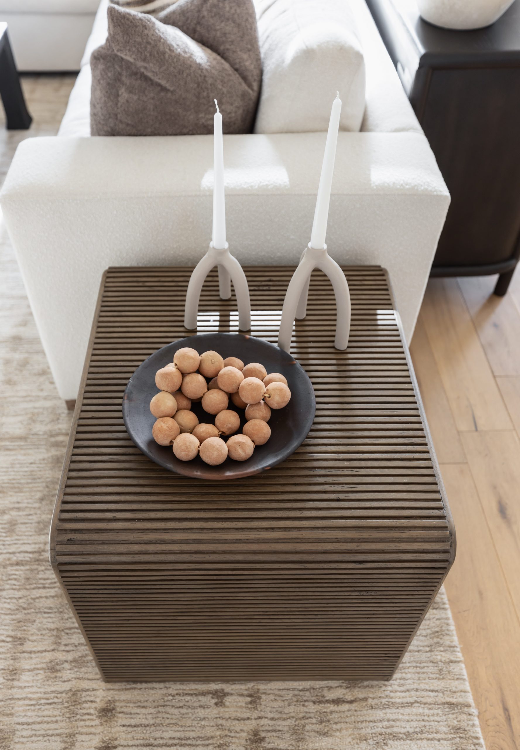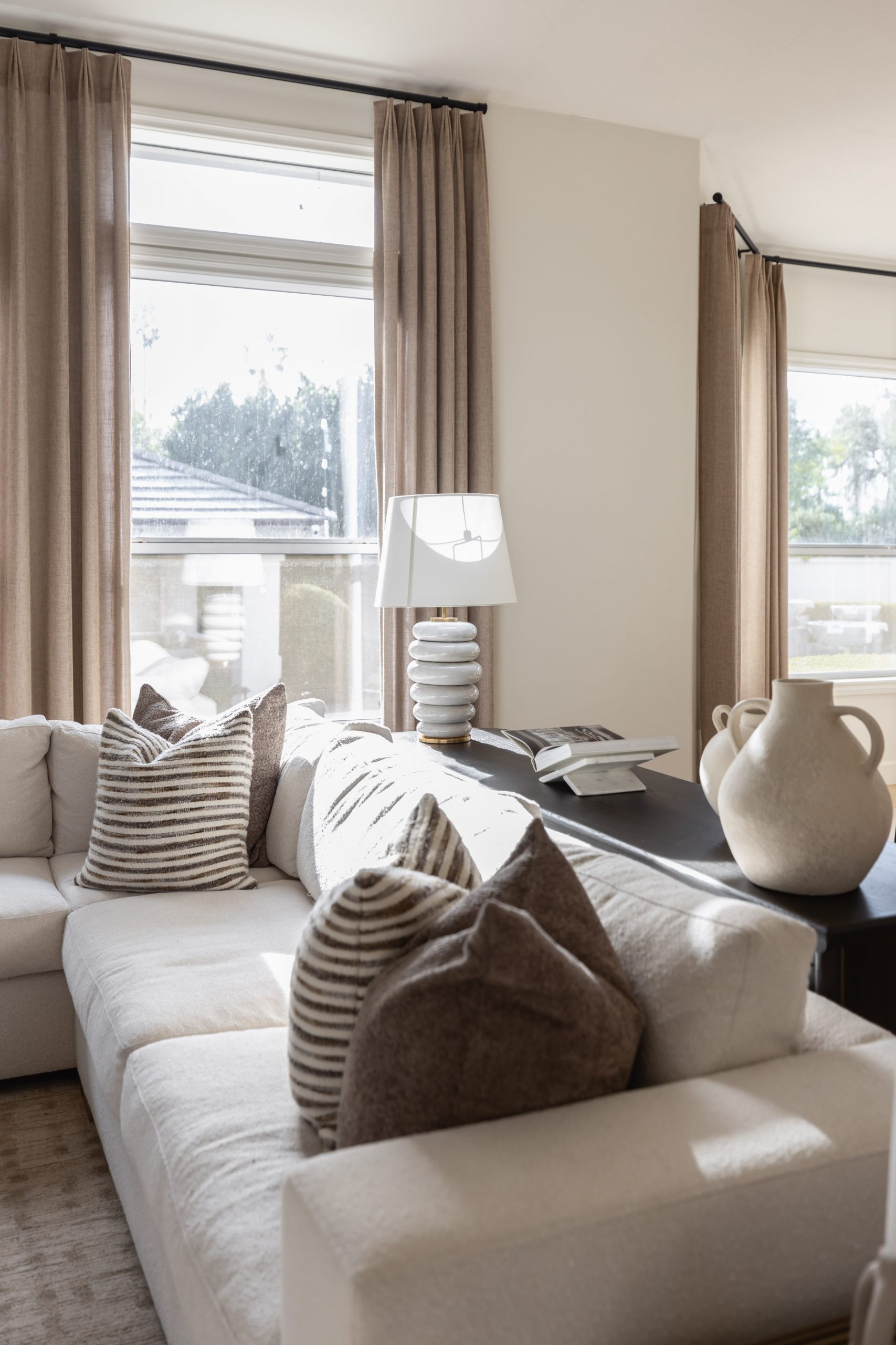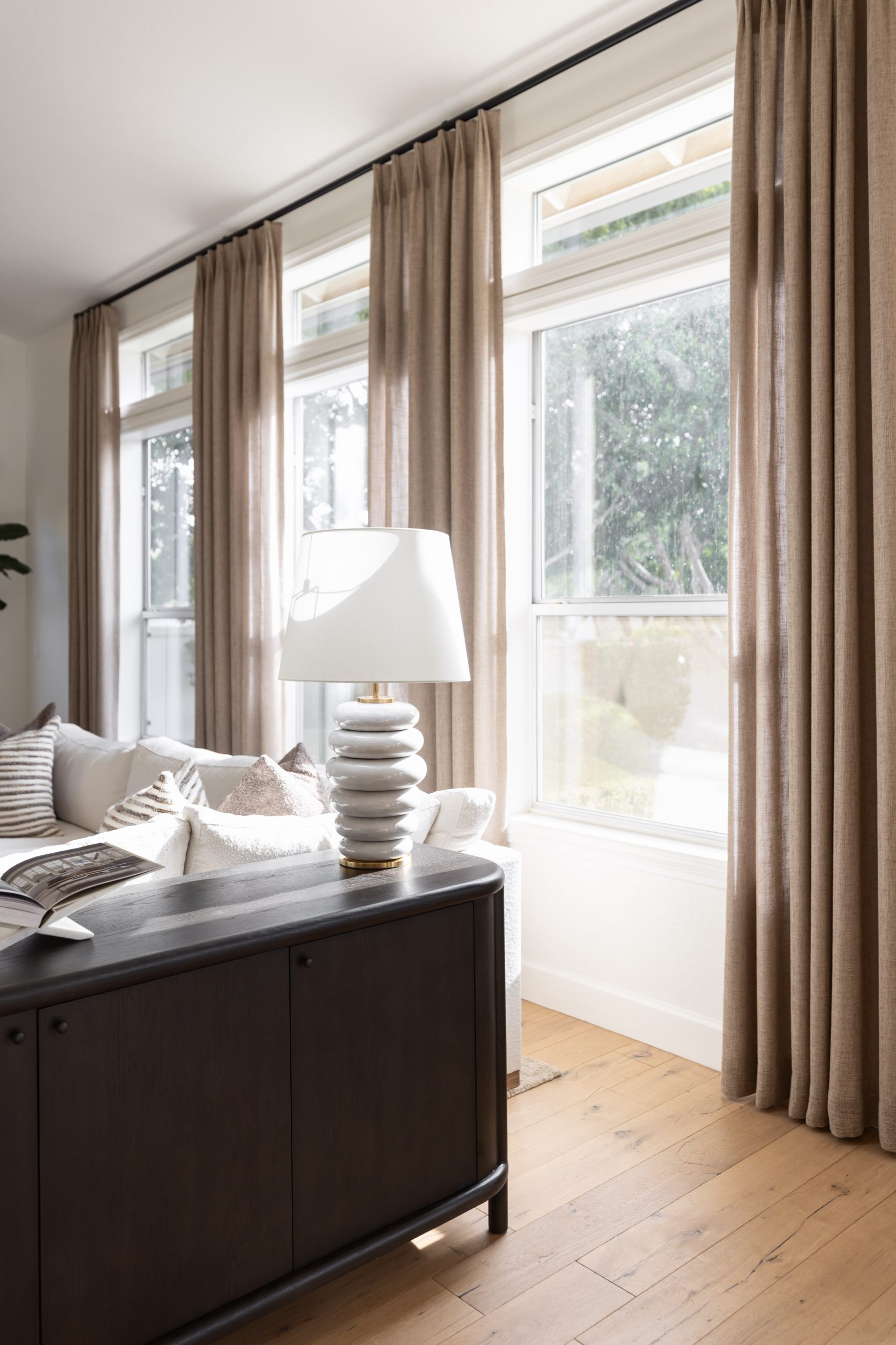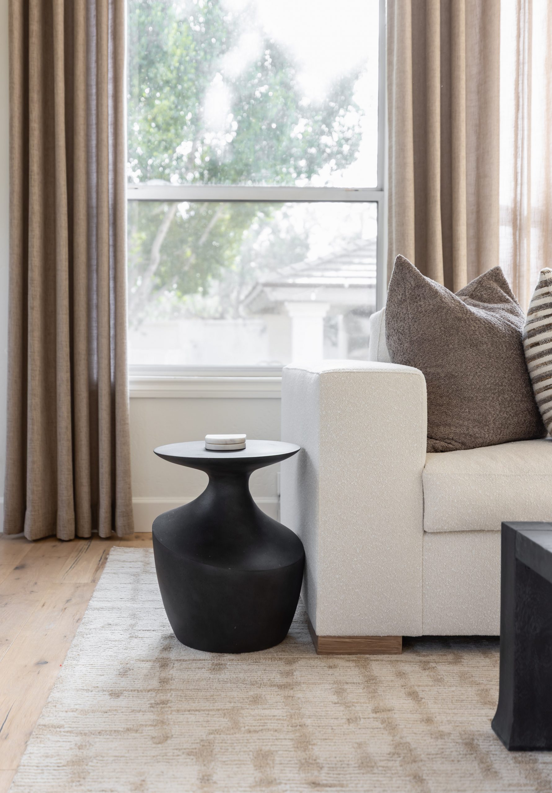 This once builder-grade living room was transformed into a layered, serene retreat grounded in warmth and architectural intention. The fireplace was simplified with a clean-lined surround and curated mantel styling, while custom window treatments add softness and depth. A sculptural light fixture now anchors the vaulted ceiling, and a rich wood console introduces contrast against the lighter upholstery, creating balance and visual weight. Thoughtfully selected furnishings, organic ceramics, and layered textiles warm the previously stark space, resulting in a cohesive, modern environment that feels elevated yet inviting for both relaxed family living and effortless entertaining.