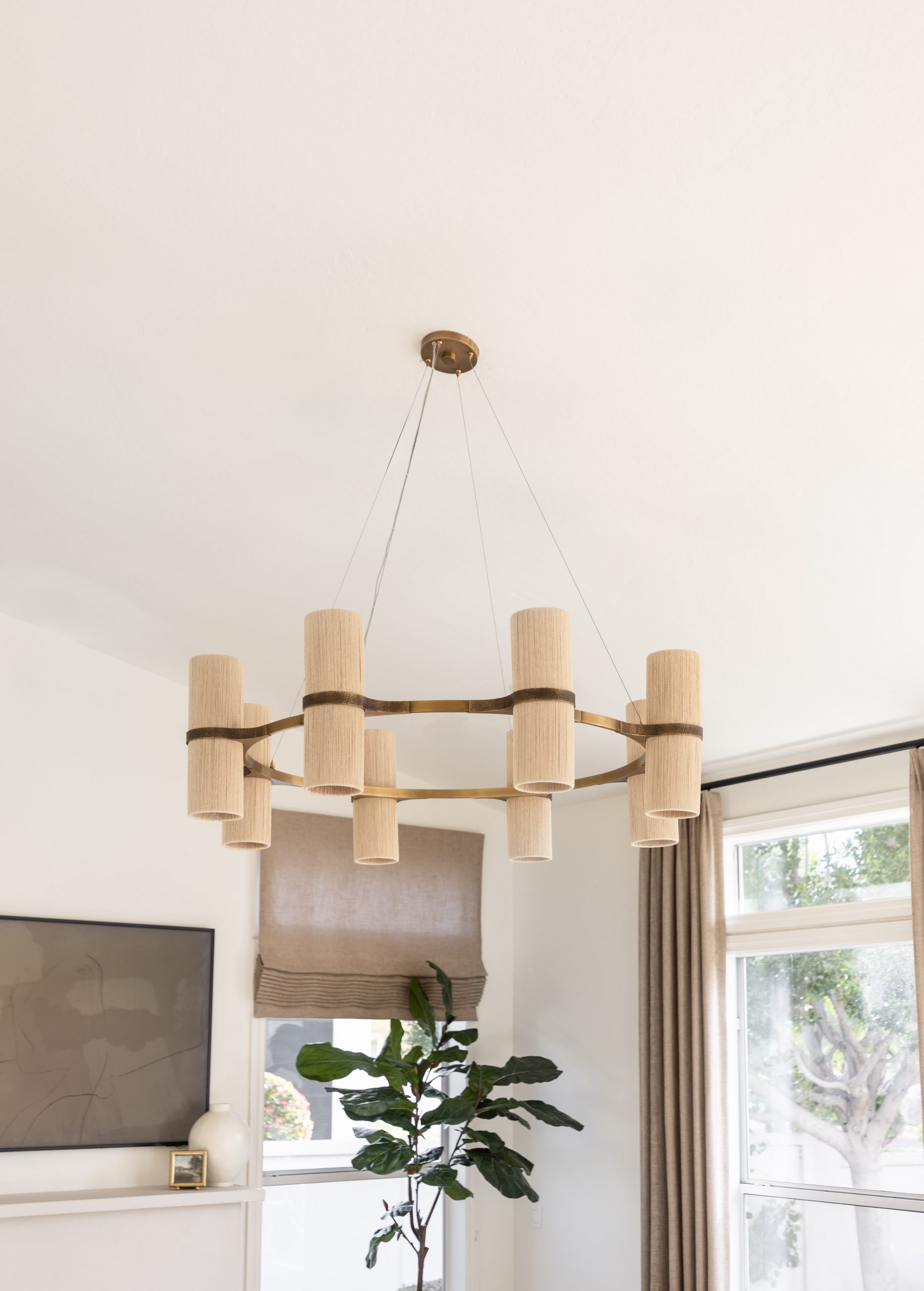 - Chandeliers By Palecek: The Sinclair Chandelier is fully adjustable chandelier features a brass frame paired with finely woven natural abaca rope shades. An antique brass canopy and customizable cable wires allow for flexible hanging heights.