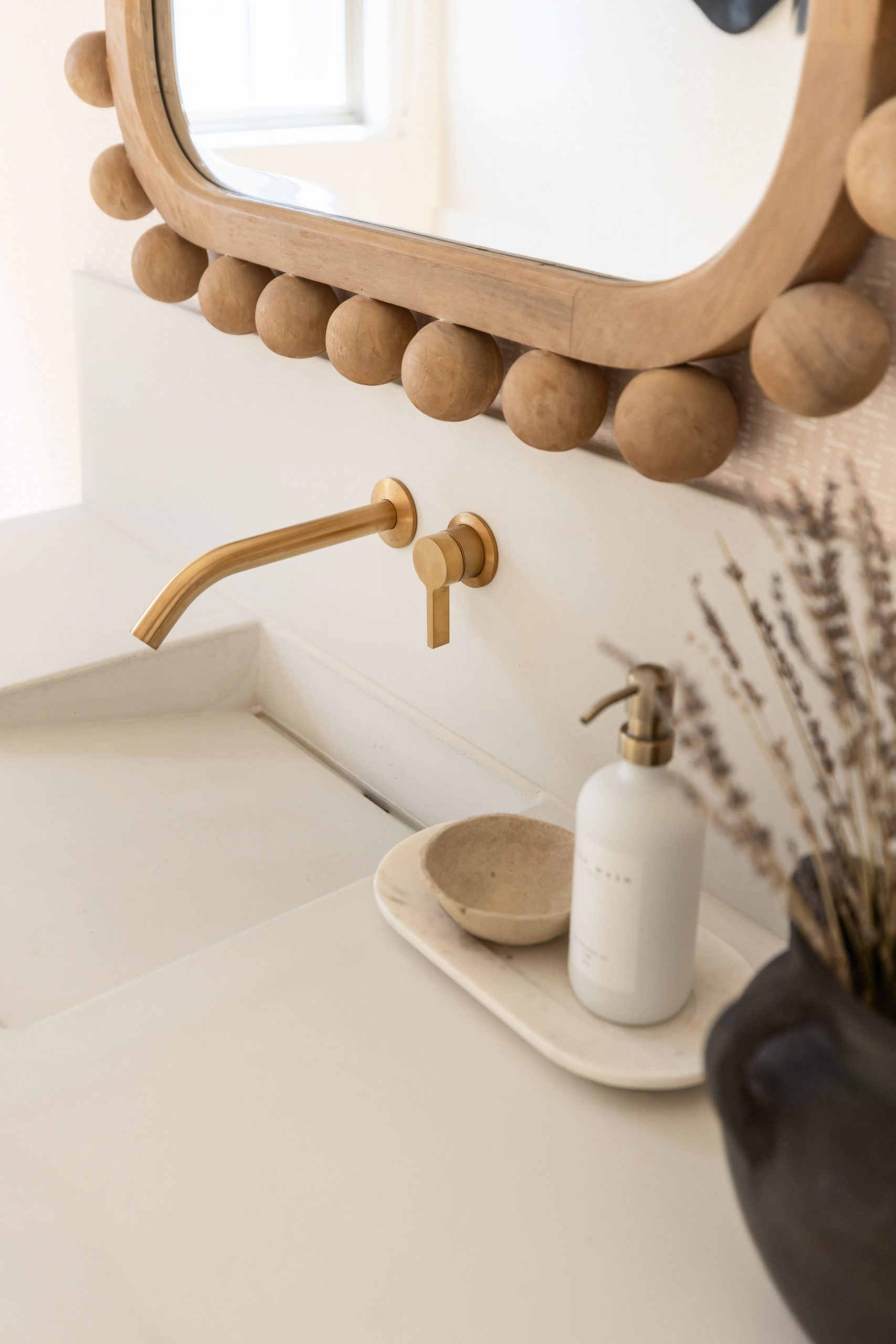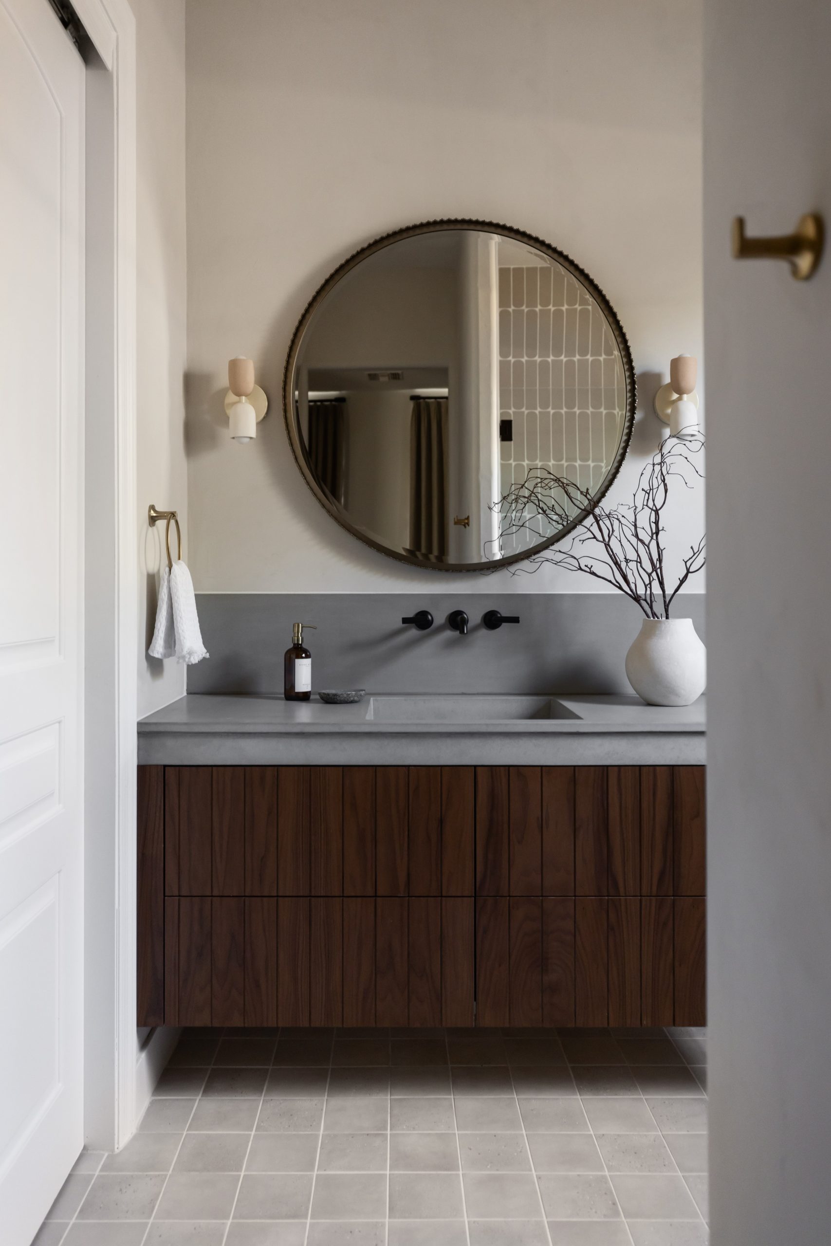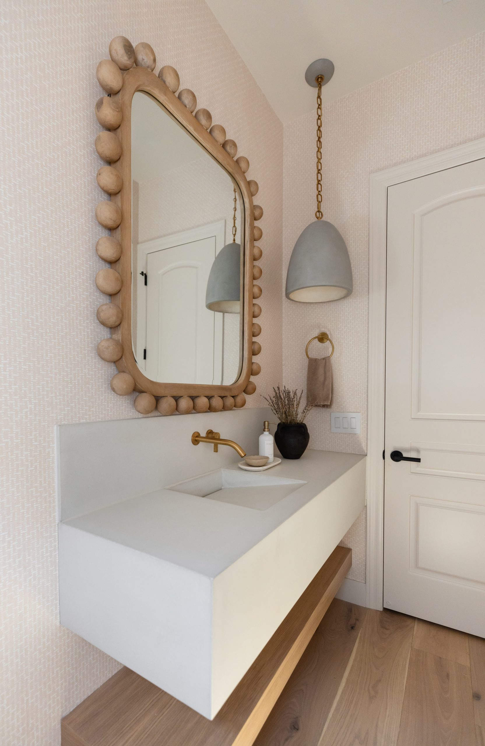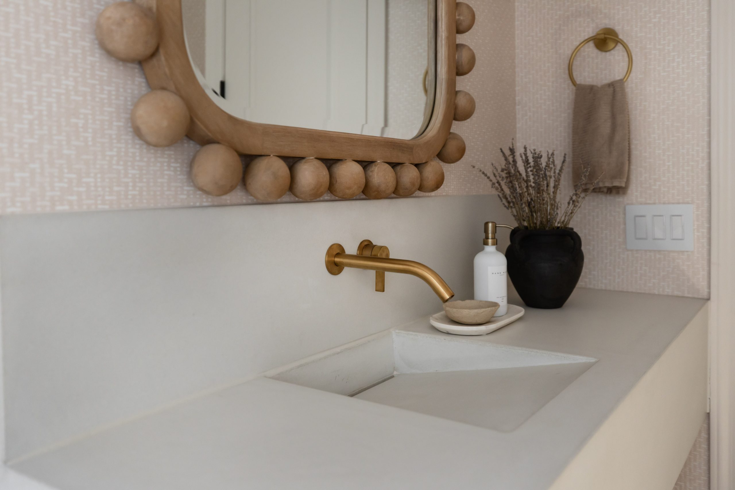 The original home was filled with outdated finishes and builder-grade fixtures, and every space needed to be completely gutted. The architecture featured heavy Mediterranean detailing that didn’t align with the client’s style, so we stripped back unnecessary elements and softened the architecture with natural materials, curved forms, and layered textures. Logistical challenges included HOA restrictions, fabrication errors with the concrete sinks, and sourcing local artisans who could meet the unique material requirements. Our team leveraged our local contractor relationships and our internal project management system Buildertrend to streamline the process and keep communication seamless from start to install.