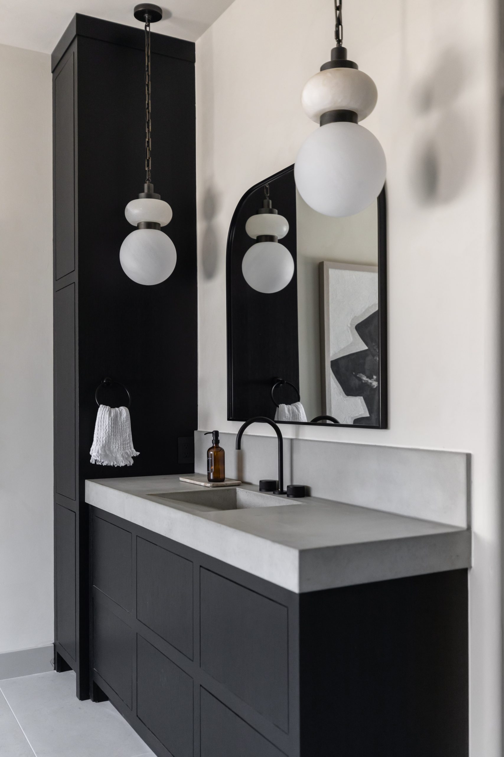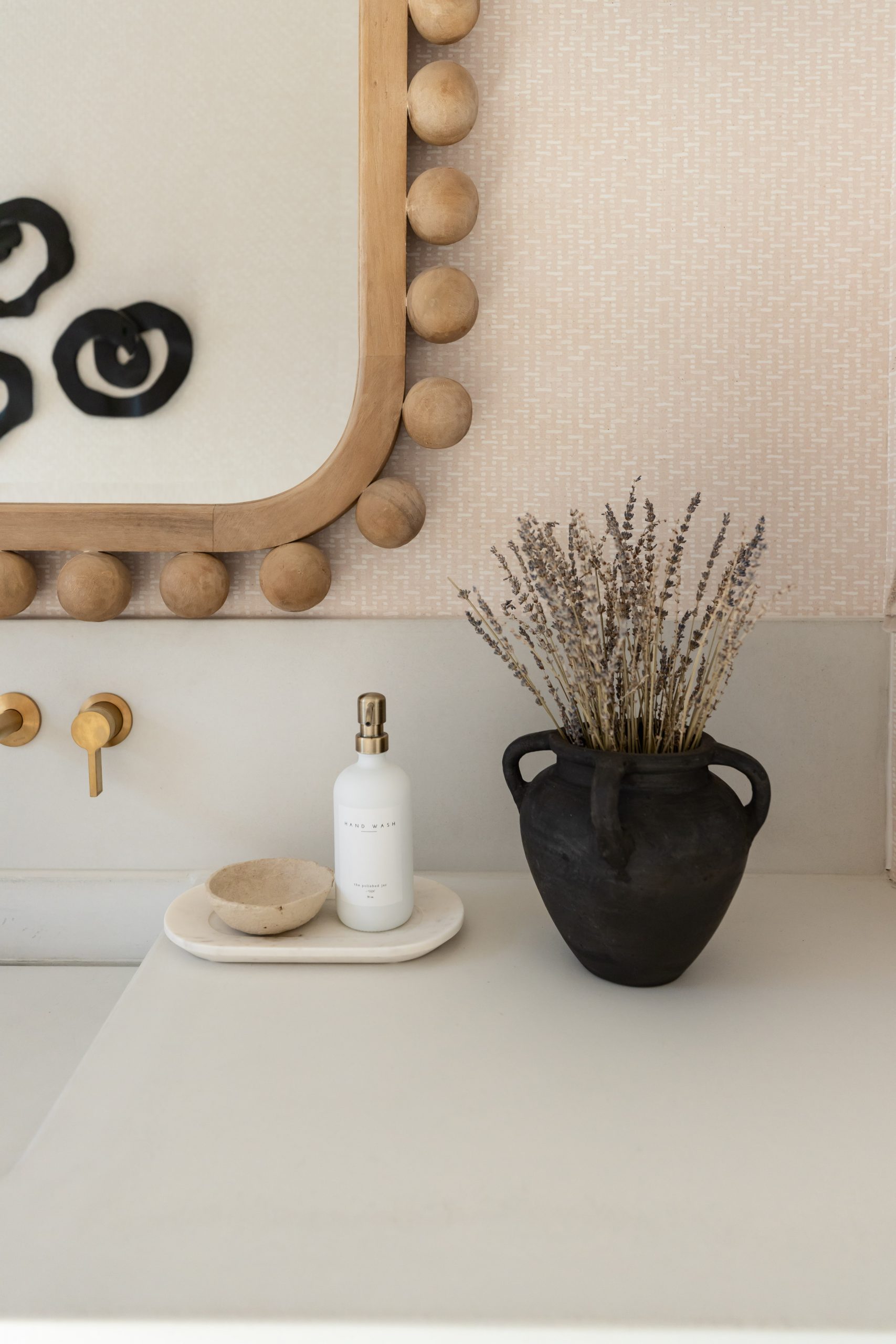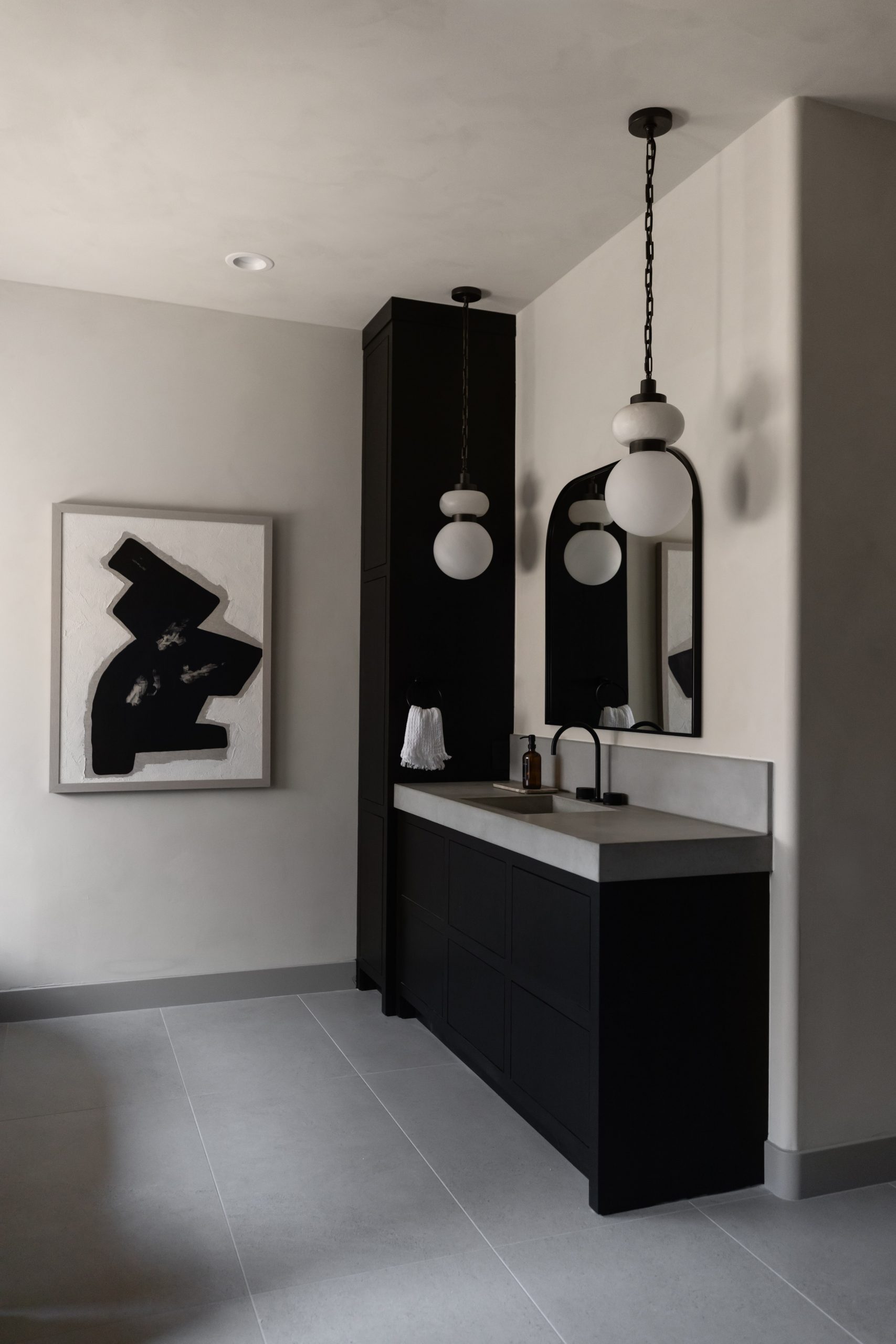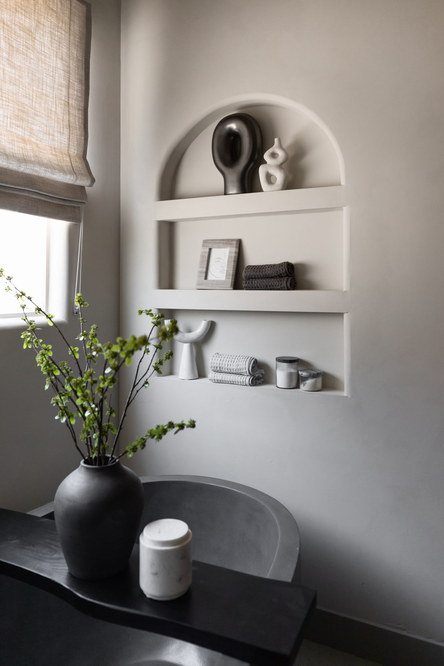 The original home was filled with outdated finishes and builder-grade fixtures, and every space needed to be completely gutted. The architecture featured heavy Mediterranean detailing that didn’t align with the client’s style, so we stripped back unnecessary elements and softened the architecture with natural materials, curved forms, and layered textures. Logistical challenges included HOA restrictions, fabrication errors with the concrete sinks, and sourcing local artisans who could meet the unique material requirements. Our team leveraged our local contractor relationships and our internal project management system Buildertrend to streamline the process and keep communication seamless from start to install.