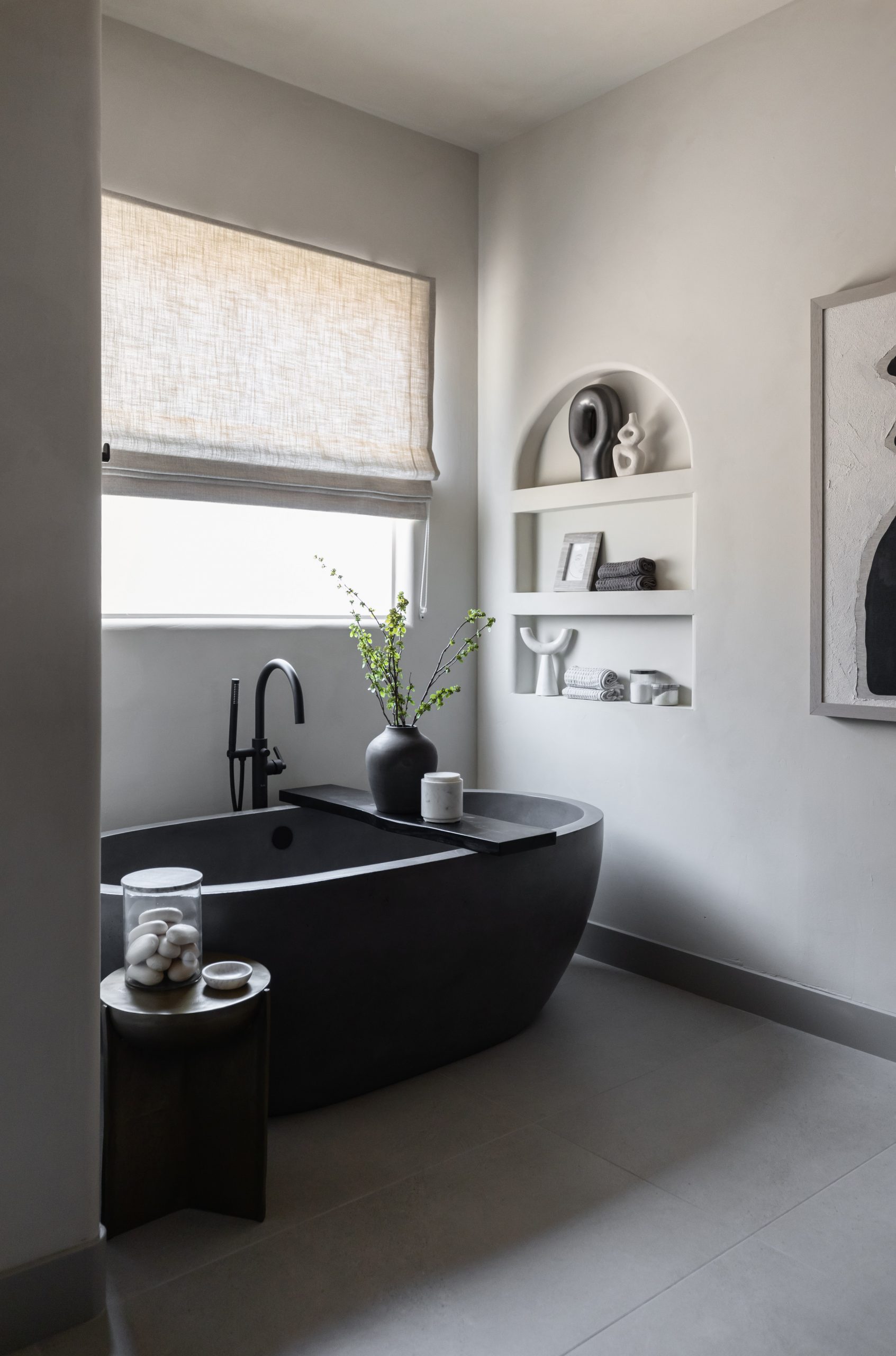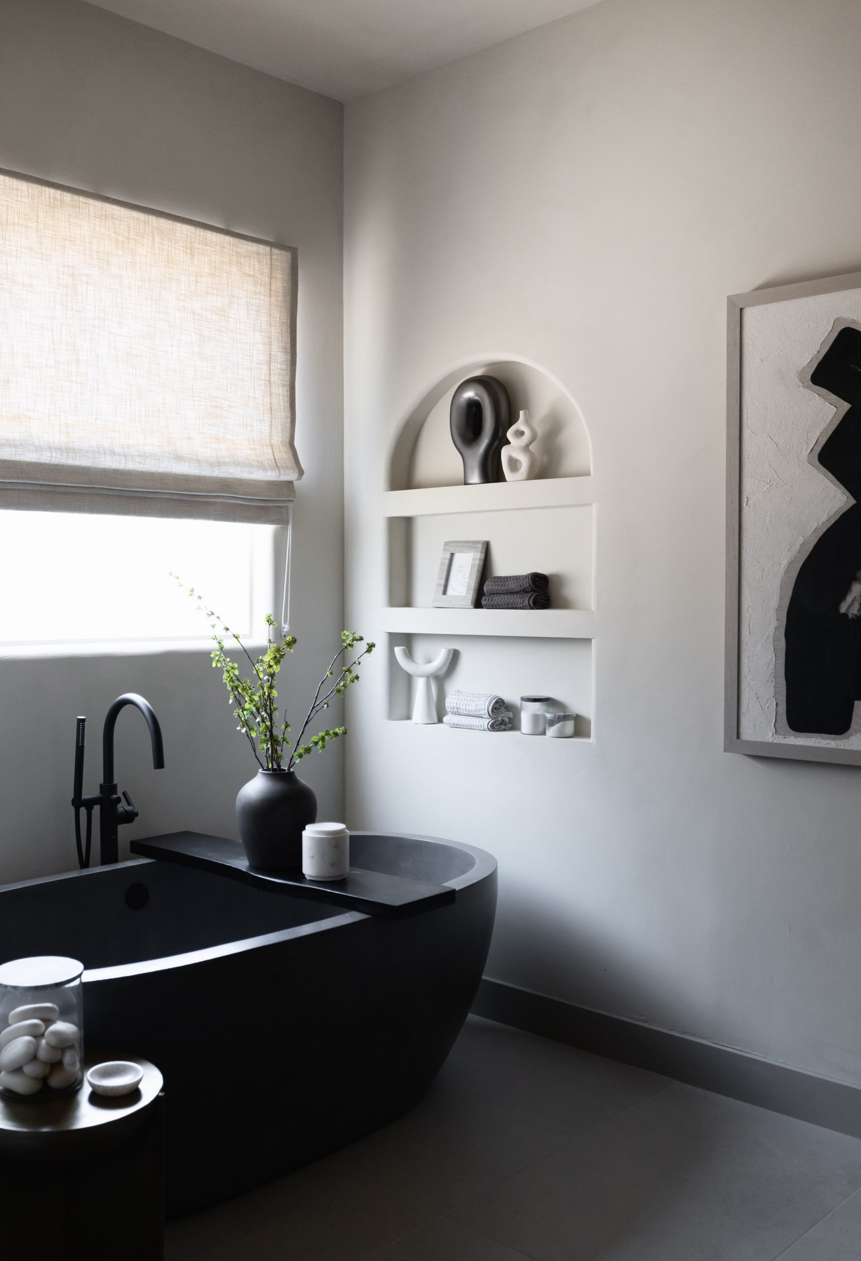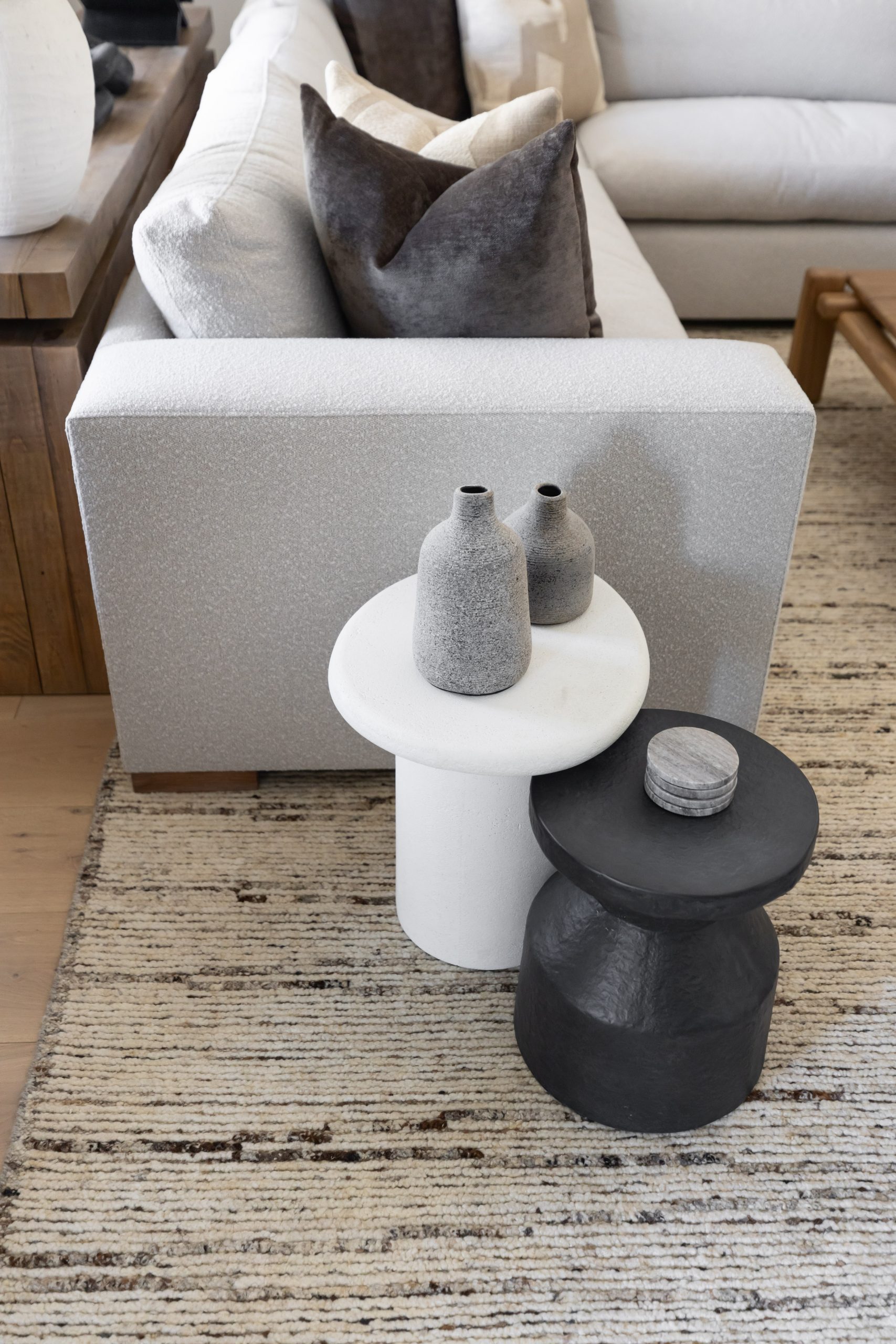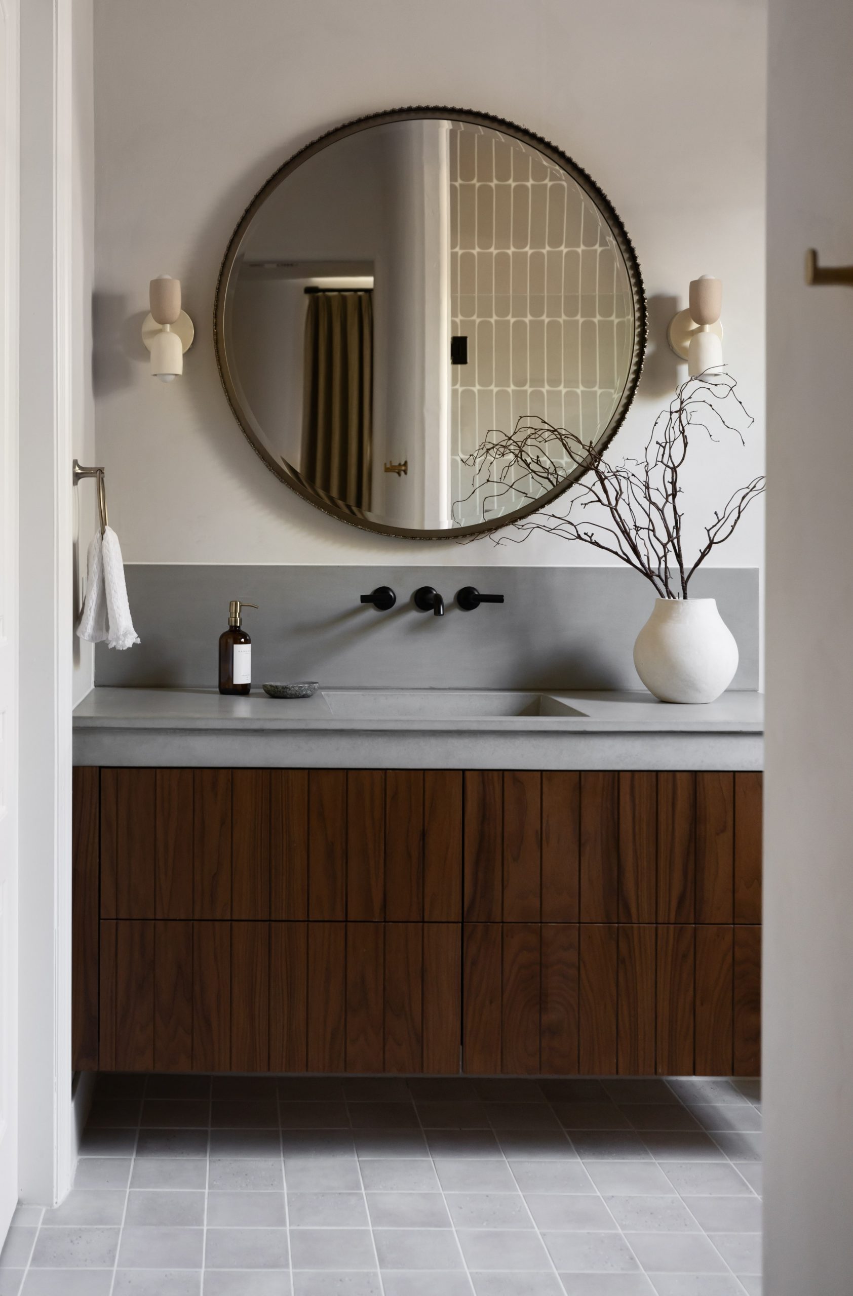 The original home was filled with outdated finishes and builder-grade fixtures, and every space needed to be completely gutted. The architecture featured heavy Mediterranean detailing that didn’t align with the client’s style, so we stripped back unnecessary elements and softened the architecture with natural materials, curved forms, and layered textures. Logistical challenges included HOA restrictions, fabrication errors with the concrete sinks, and sourcing local artisans who could meet the unique material requirements. Our team leveraged our local contractor relationships and our internal project management system Buildertrend to streamline the process and keep communication seamless from start to install.