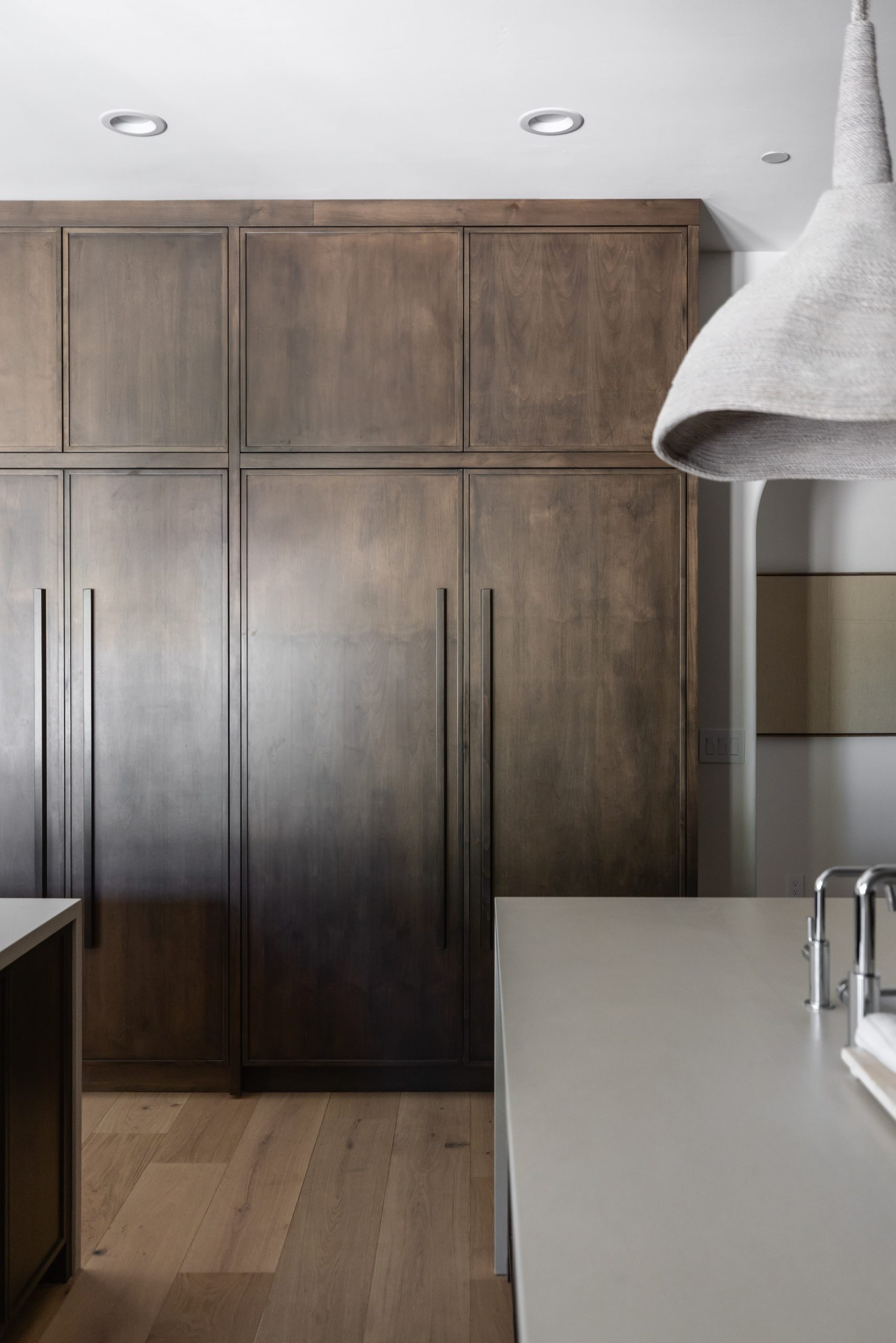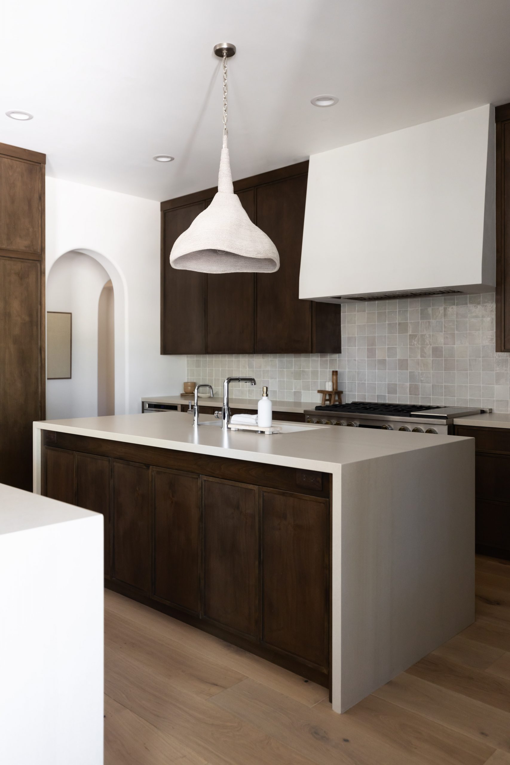 The kitchen in this North Scottsdale home went from a dated, heavy Mediterranean space to a calm, grounded centerpiece of the home. We removed bulky cabinetry and dark finishes, replacing them with warm wood tones, a custom plaster hood, integrated shelving, and matte porcelain countertops that mimic natural stone—creating a space that feels both modern and deeply serene.